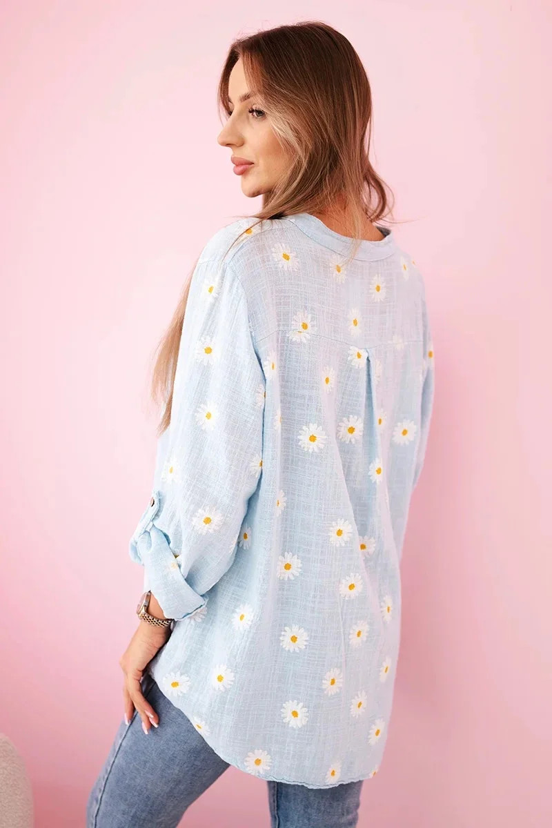 Hledáte stylovou, pohodlnou a univerzální halenku? Tato košilová halenka s potiskem sedmikrásek je perfektní volbou pro každou příležitost! Je vyrobena z lehkého, prodyšného materiálu, který je ideální na jaro a léto. Volný střih zajišťuje volnost pohybu a jemný květinový vzor dodává ženský šarm. Dlouhé rukávy s možností ohrnutí umožňují různé způsoby nošení podle vašeho stylu.