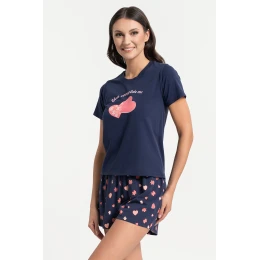 Dwuczęściowa piżama damska Moraj: t-shirt z krótkim rękawem i okrągłym dekoltem oraz szorty na elastycznej talii. Góra z dużym nadrukiem, dół z drobnym wzorem i kontrastową lamówką, boki szortów zaokrąglone. Miękka, oddychająca dzianina bawełniana z dodatkiem elastanu zapewnia wygodę i swobodę ruchów. Model idealny na cieplejsze noce i domowy wypoczynek. Skład: 95% bawełna, 5% elastan.