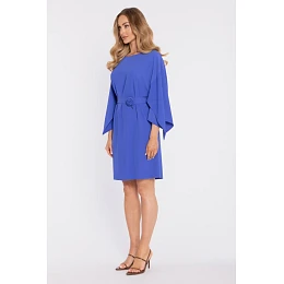 95% polyester 5% elastane MATERIAL Fabric: smooth fabric with a subtle sheen. PRODUCT DETAILS Neckline: boat / modest round-boat shape – subtly highlights the neckline. Sleeves: wide, relaxed kimono/cape-style sleeves – fluid and statement-making. Waist: defined with a belt (separate piece, included with the dress) Skirt: straight, easy fit with a subtle A-line feel. Closure: none, slip-on style (pulled on over the head). Pockets: none. Lining: none. Model: M908. Designed and made in Poland. The model in the photo is 171 cm tall and is wearing size S. FIT AND CUT Style: minimalist dress with wide sleeves and a matching belt. Shape: relaxed kimono top, waist shaped with the belt, clean straight skirt. Length: above the knee.