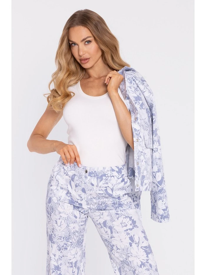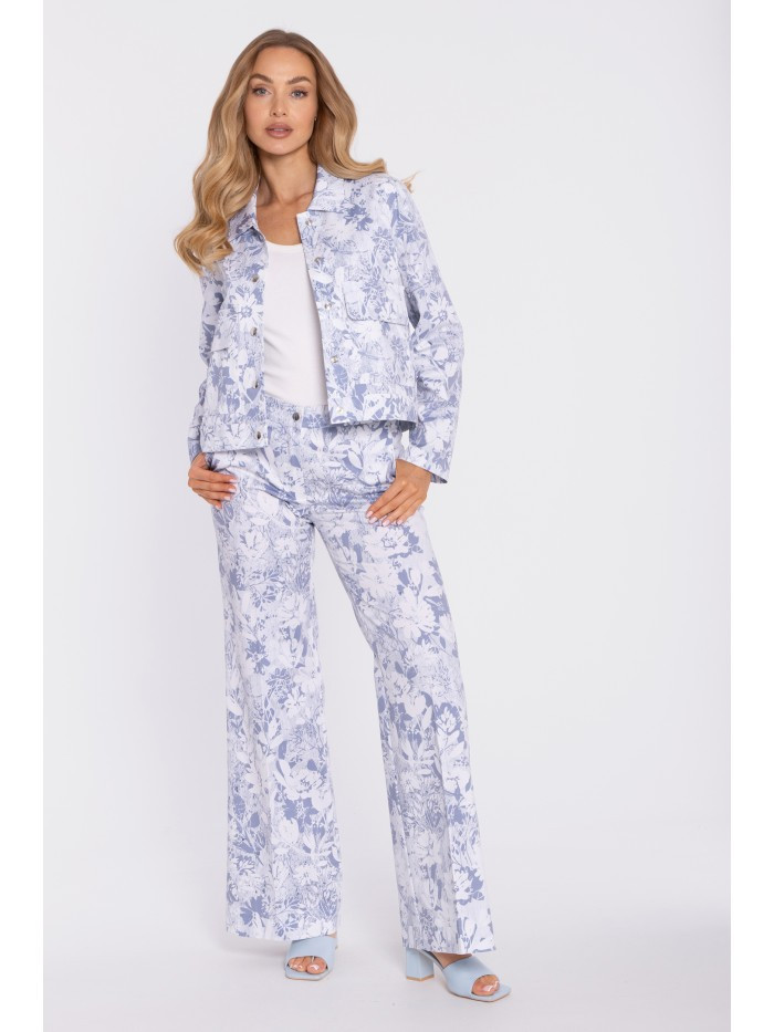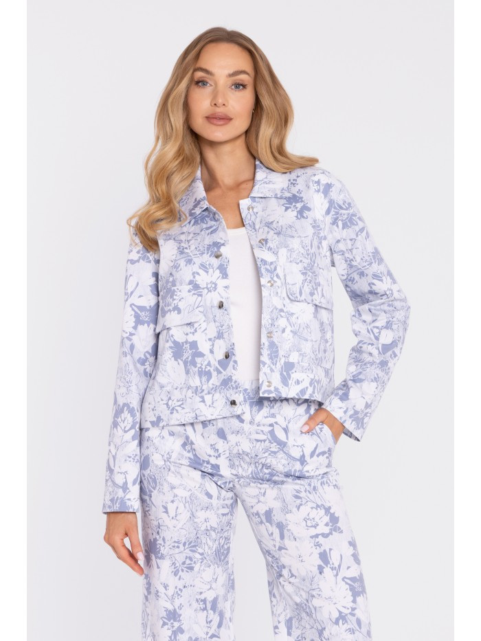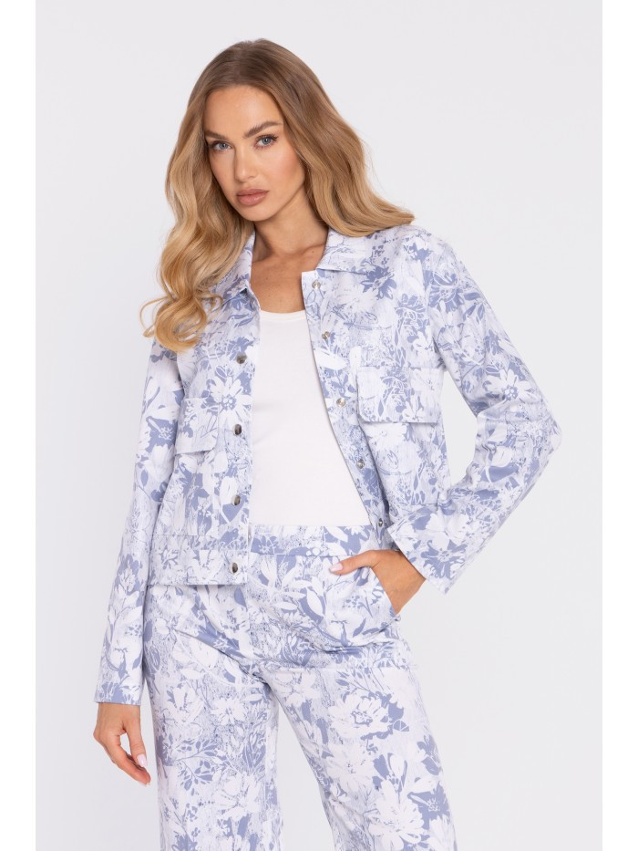 materiál: 95% polyester 5% elastan LÁTKA: hladká potištěná látka. PODROBNOSTI O PRODUKTU Potisk: romantický květinový vzor. Límec: klasický košilový límec. Rukávy: dlouhé rovné rukávy. Zapínání: kovové knoflíky s patkou vpředu. Kapsy: dvě velké přední kapsy s klopami. Střih: krátký, rovný, lehce krabicové siluety. Lem: zakončený širokou lemovkou pro čistý, strukturovaný vzhled. Podšívka: žádná. Model: M910. Navrženo a vyrobeno v Polsku. Modelka na fotografii měří 171 cm a má na sobě velikost S. STŘIH A VÝSTŘIH Styl: zkrácená bunda s moderním smart casual střihem. Tvar: rovný, lehký střih, který nelepí; skvělý pro vyvážené proporce. Délka: zkrácená / délka přes boky.