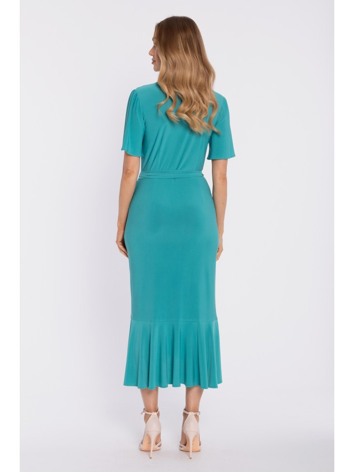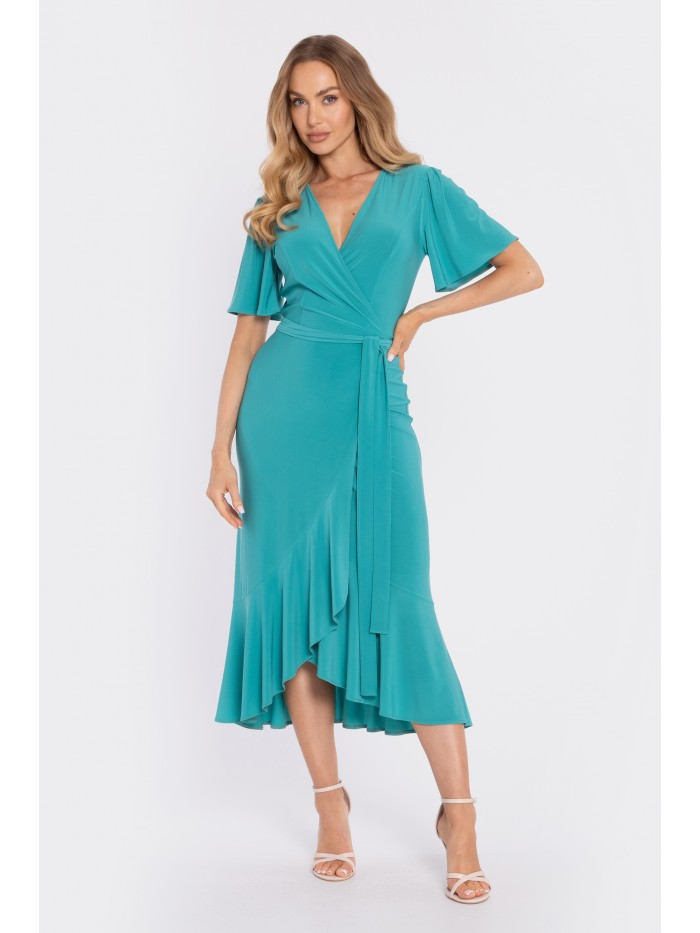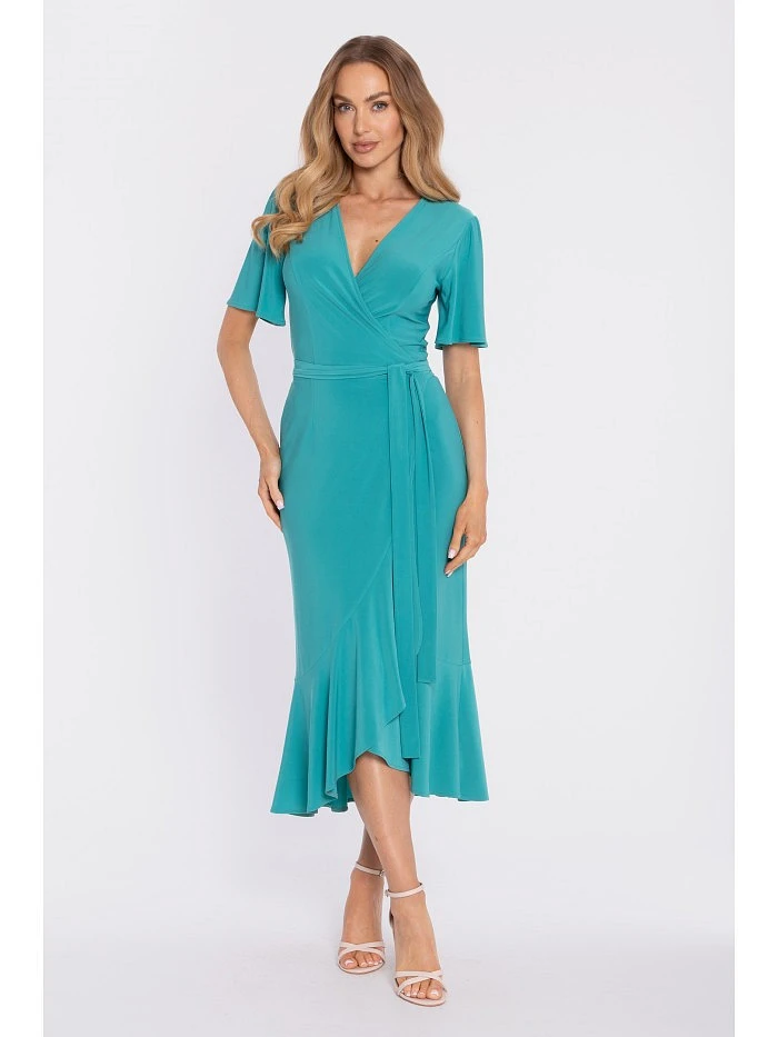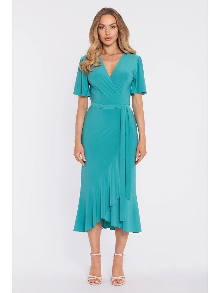 95% polyester 5% elastane MATERIAL Fabric: Smooth knit – soft, elastic, and comfortable to wear. PRODUCT DETAILS Neckline: V-neck, wrap-style (cross-over). Sleeves: short, relaxed, slightly flared. Waist: defined with a self-tie belt. Side detail: ruching on one side for a flattering, waist-slimming effect. Skirt: midi length with an asymmetric hem and a soft ruffle. Closure: fully wrap-style, ties at the side (self-tie straps/belt in the same fabric); no zipper. Pockets: none. Lining: none. Model: M912. Designed and made in Poland. The model in the photo is 171 cm tall and is wearing size S. FIT AND CUT Style: feminine wrap-style midi dress with a ruffled hem. Shape: flattering V-neck, defined waist, softly draped skirt with movement. Length: midi.