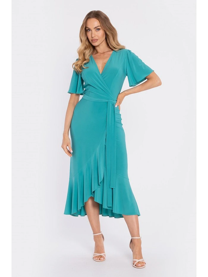 model 22040695 Zavinovací midi šaty s volánem a řasením tyrkysové - Moe