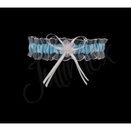 <p>Podwiązka z białym tiulem i niebieską satyną z ozdobą w kształcie kwiatka z naszytymi perełkami</p>