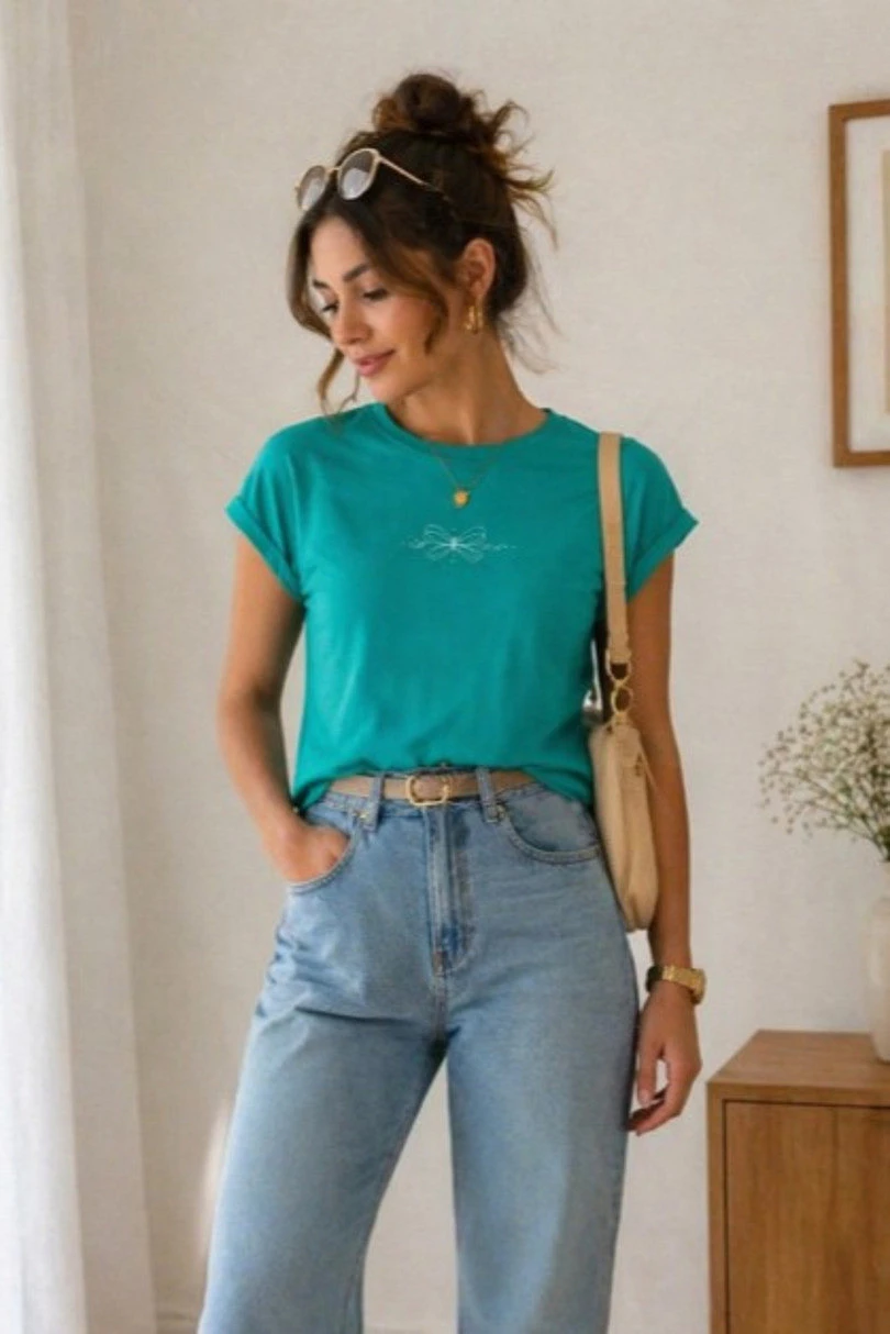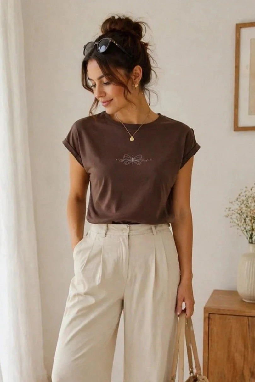 Tato stylová a nadčasová dámská halenka je ideální volbou pro ženy, které si cení pohodlí a módního každodenního vzhledu. Halenka je vyrobena z měkkého, na dotek příjemného úpletu a je pohodlná na celodenní nošení. Díky klasickému rovnému střihu se halenka dokonale přizpůsobí postavě a hodí se k mnoha outfitům. Krátké rukávy s módním ohrnutím dodávají moderní nádech, zatímco decentní minimalistický potisk s jemnými kamínky dodává elegantní nádech. Rovně střižená spodní část umožňuje halenku nosit buď zastrčenou do kalhot, nebo volně. Jedná se o univerzální kousek šatníku, který se bude hodit jak k ležérním, tak elegantnějším outfitům.