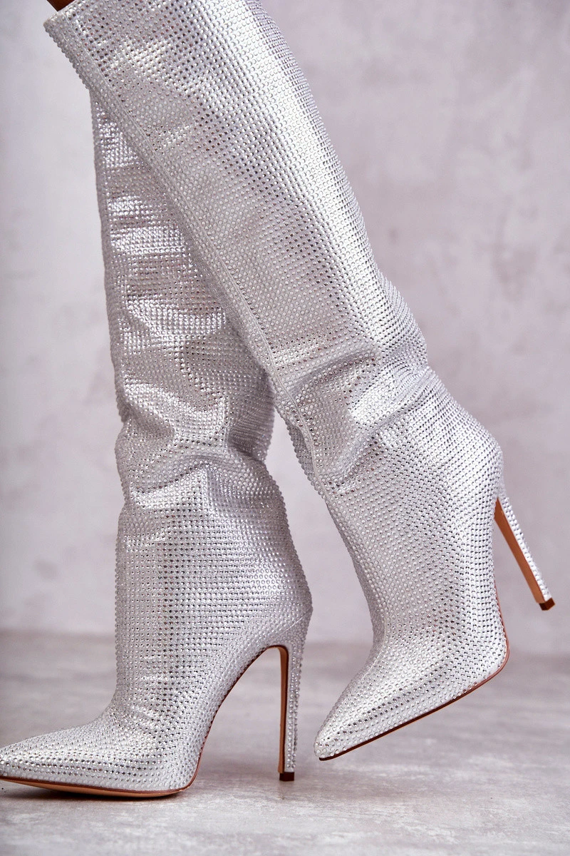 Módní kozačky na vysokém podpatku s kubickými zirkony stříbrne model 21597033 - Boto