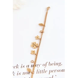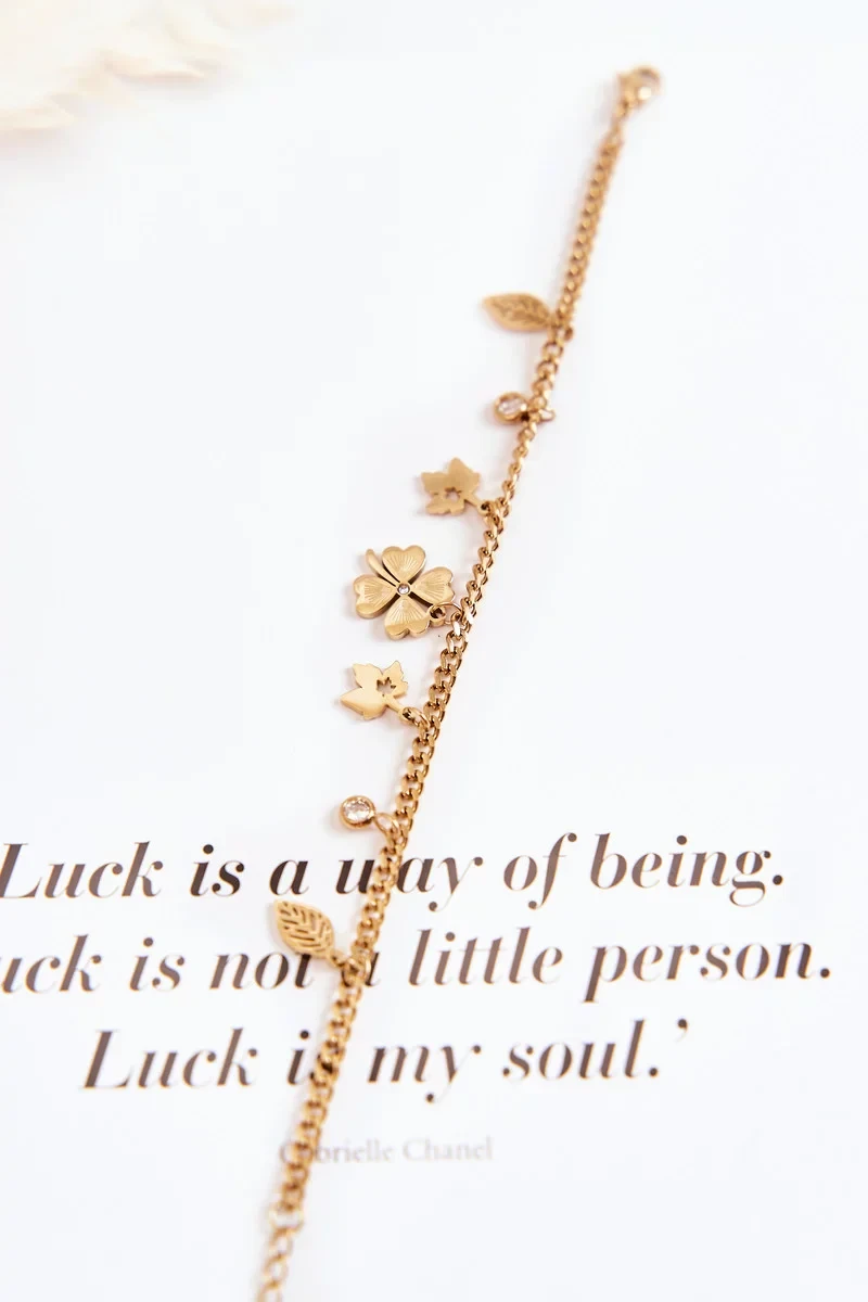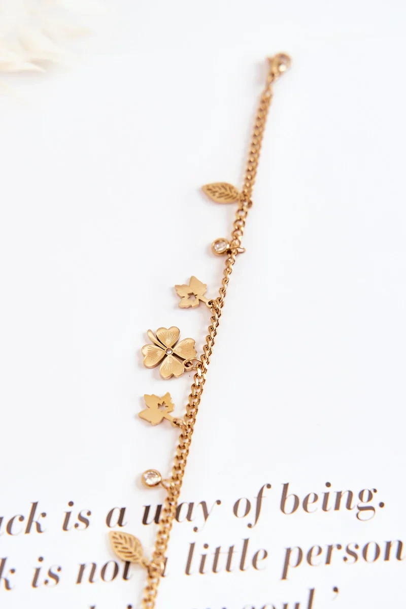Náramek je vyroben z nerezové oceli. Má možnost nastavení délky a několik přívěsků v podobě lístků, jetele a zirkonu. Náramek vypadá velmi zvláštně. Podívejte se také na naši další nabídku modelů šperků. Musíte to rozhodně mít!