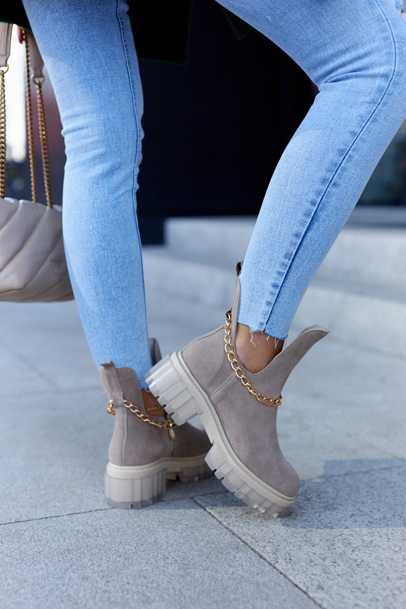 Boty, které potěší každého! Vyrobeno z přírodní semišové kůže s jemnými řezy na straně svršku. Navíc zapínání na zip. Ozdobný řetízek je odnímatelný. Kulatý nos. Masivní, plochý podpatek a platforma jsou vyrobeny z pryžového materiálu. Efektivní střih, který dodá vaší stylizaci charakter! Pohodlná stélka z přírodní kůže se postará o vaše pohodlí při každodenním používání. Při výběru velikosti použijte tabulku velikostí.