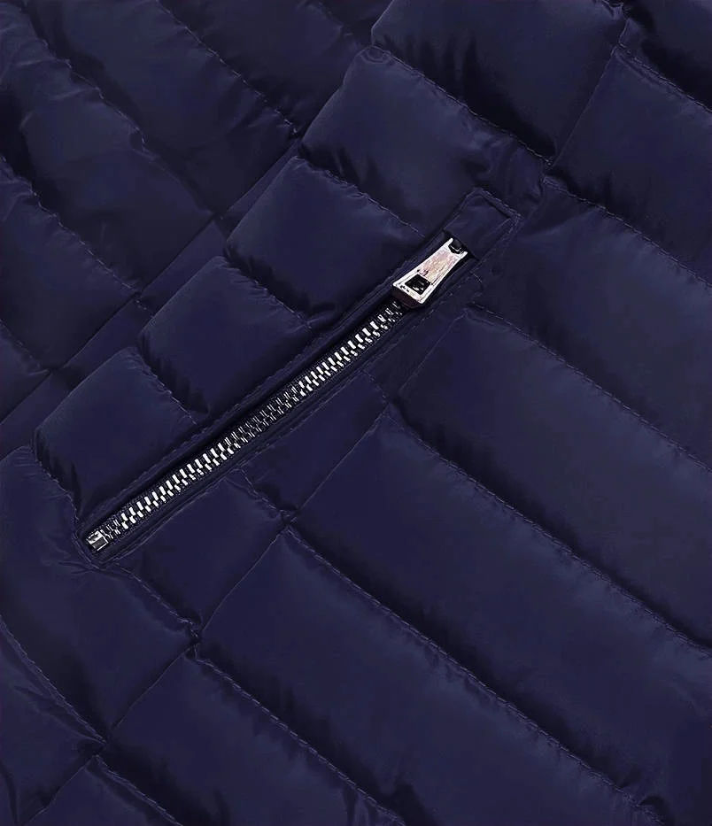 Bunda je prošívaná, je zateplená vrstvou syntetické péřové výplně a má délku k bokům. Model má dvě kapsy a zapíná se zipem.