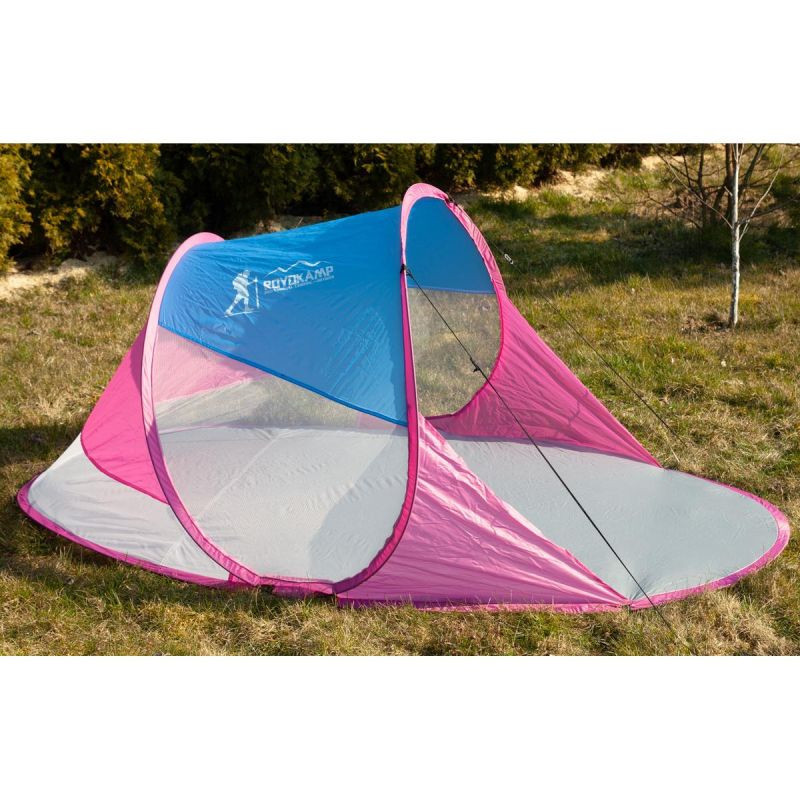 NAMIOT PARAWAN PLAŻOWY SAMOROZKŁADAJĄCY ROYOKAMP sprawdzi się podczas wszystkich Twoich wyjazdów nad morze, jezioro czy na biwak. Ten samorozkładający się namiot od ROYOKAMP, to wysokiej jakości produkt o szerokości 120 cm, głębokości 200 cm oraz wysokości 88 cm, spakowany w wygodny pokrowiec ułatwiający jego transport i przechowywanie. Jego stelaż z włókna szklanego charakteryzuje się dużą lekkością i odpornością na uszkodzenia mechaniczne. Pokrycie uszyte zostało z mocnego poliestru 150T, który chroni przed szkodliwym promieniowaniem UV oraz zapewni wodoodporność na poziomie 400 mm słupa wody. Po bokach zostały umieszczone liczne wstawki z siatki, które zapewnią wysoką wentylację w samym środku.