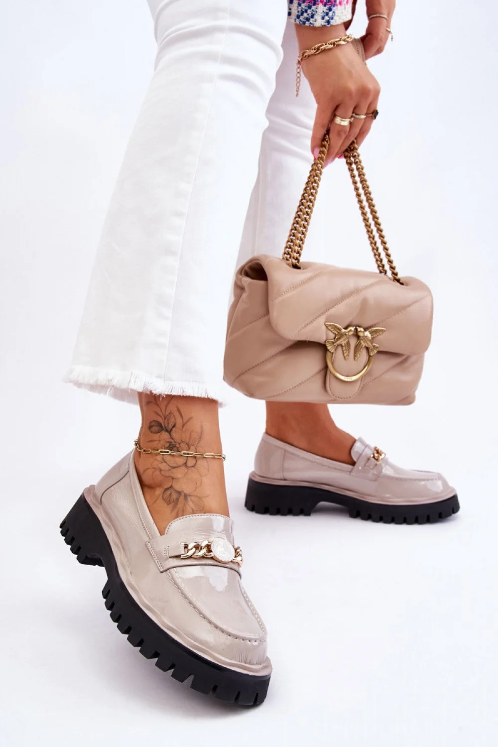 Krásné mokasíny z ekologické kůže! Tento střih bude ideální pro jarní a podzimní sezónu. Kotníkový svršek s ozdobným řetízkem na přední straně. Podrážka je vyrobena z gumového materiálu s běhounem. Boty jsou posazeny na platformě a plochém podpatku. Měkká, pohodlná stélka je vyrobena z přírodní kůže. Tento model se bude skvěle hodit k ležérním i elegantnějším outfitům!