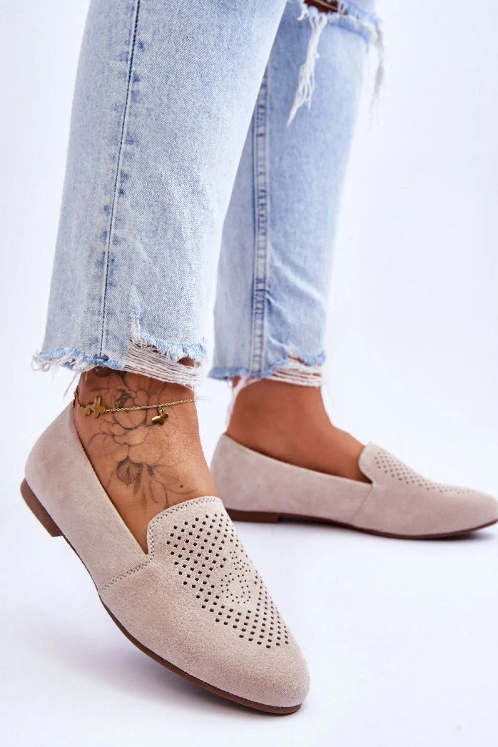 Krásné dámské mokasíny z přírodního semiše. Na přední straně mají ozdobný prolamovaný vzor. Tento model stojí na plochém podpatku a má protiskluzovou podrážku. Mokasíny mají pohodlnou stélku z přírodní kůže. Pultík na patě těchto bot je jemně polstrovaný. Tuto obuv prostě musíte mít!
