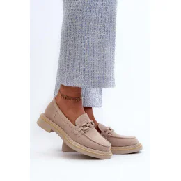 Dámské mokasíny vyrobené z přírodní semiše. Plochý podpatek zaručuje stabilitu a pohodlí při chůzi. Dodatečný ozdobný prvek vpředu jim dodává originalitu, což je činí nejen praktickými, ale také módními. Tyto mokasíny budou ideálním doplňkem mnoha různých stylů, jak ležérních, tak formálnějších.