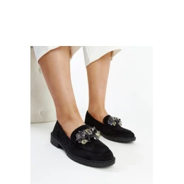 Černé semišové mokasíny Zemzem jsou kombinací elegance a pohodlí v jednom. Jejich moderní vzhled s kulatou špičkou a navíc umístěné krystaly je činí velmi okouzlujícími. Vyrobené z vysoce kvalitního semiše mají pružnou gumovou podrážku, co zajišťuje pohodlí při nošení. Tyto nízké, zasouvací mokasíny budou skvělou volbou jak na každý den, tak na speciální příležitosti. Ideální na nadcházející jaro-léto.