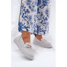 Mokasíny pro dámy vyrobené z přírodní kůže, umístěné na jemném klínku, spojují eleganci s pohodlím. Zaoblené špičky zajistí pohodlí po celý den a decentní zlatá ozdoba vpředu dodává botám jedinečný charakter. Kožená vložka pečuje o správnou amortizaci, zajišťující pohodlí při každém kroku. Tyto mokasíny budou skvělou volbou na každý den, skvěle ladící s elegantními i každodenními styly.