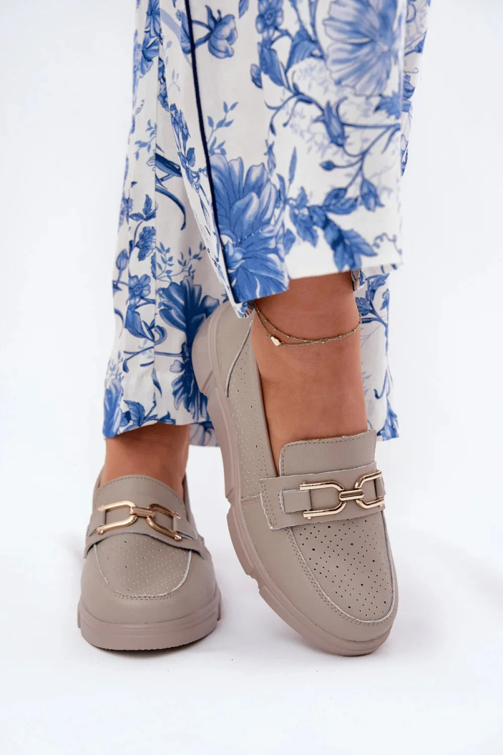 Mokasíny pro ženy vyrobené z přírodní kůže, umístěné na jemném klínu, kombinují eleganci s pohodlím. Zaoblené špičky zajistí pohodlí po celý den, a subtilní zlatá ozdoba vpředu dodává botám výjimečný charakter. Kožená vložka pečuje o správnou absorpci, poskytující pohodlí každým krokem. Tyto mokasíny budou skvělou volbou na každý den, skvěle se hodící jak k elegantním, tak k volným stylizacím.