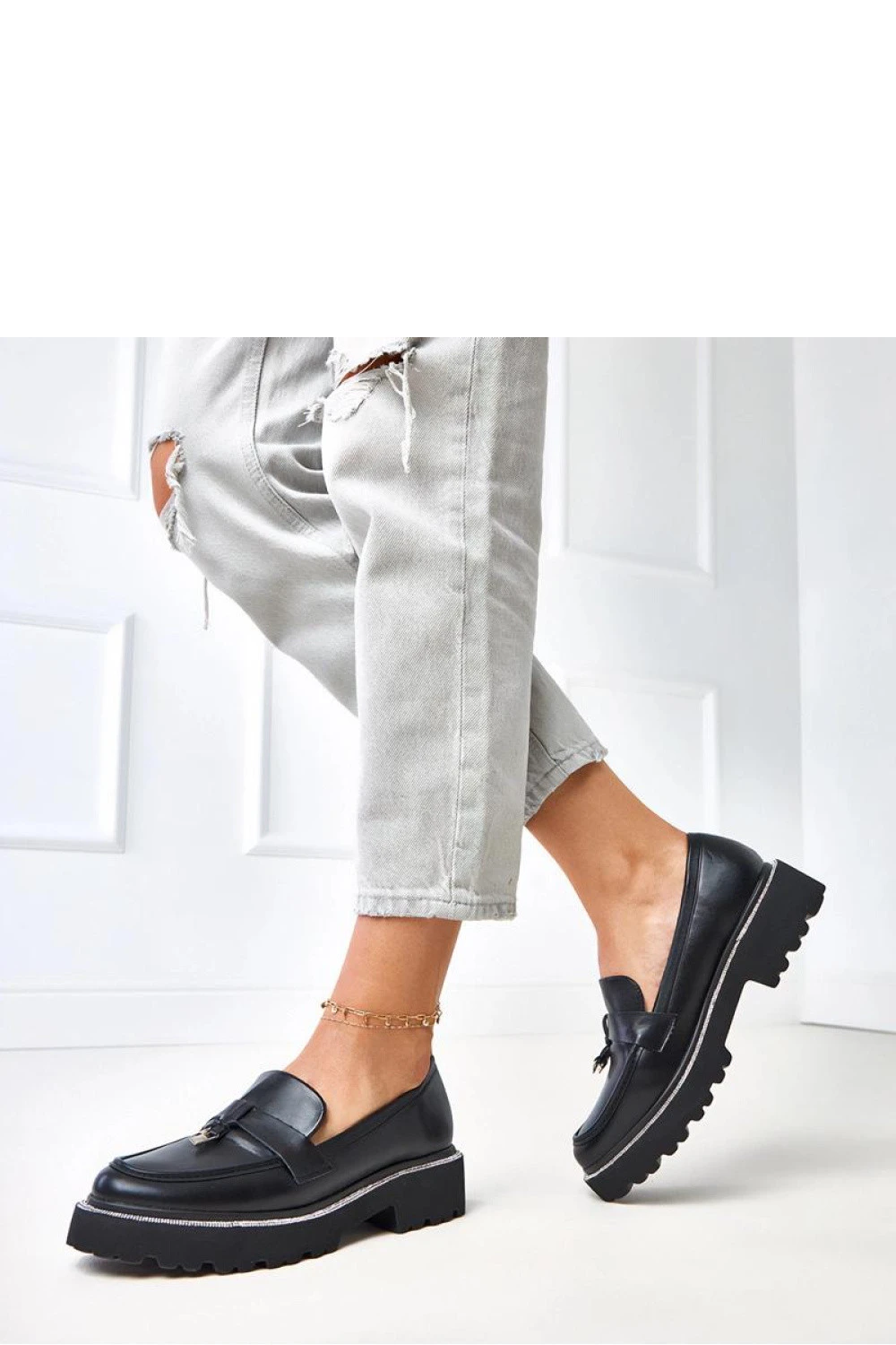 Elegantní dámské mokasíny vyrobené z vysoce kvalitní ekologické kůže. Klasický, nízký střih s kulatou špičkou byl oživen kovovou ozdobou s jemnými zirkony, které botám dodávají elegantní charakter. Model se zasouváním, velmi pohodlný při každodenním nošení, s pevným podpatkem výšky 3,5 cm. Vložka z ekologické kůže zvyšuje pohodlí nošení a univerzální design dělá mokasíny skvělým doplňkem jak k volnočasovým, tak elegantním stylizacím. Ideální pro ženy, které ocení kombinaci pohodlí a nadčasové elegance.