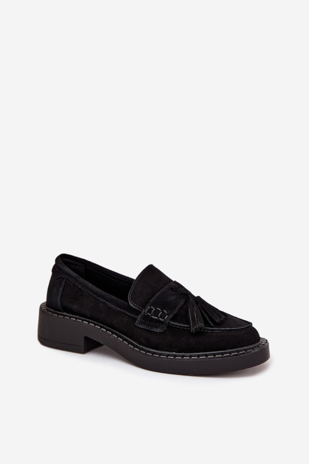 Dámské mokasíny vyrobené z přírodního semiše. Umístěné na plochém, stabilním podpatku. Fíky jim dodávají jedinečný šarm. Tyto mokasíny budou ideálním doplňkem mnoha různých stylizací, jak casualových, tak i elegantnějších.