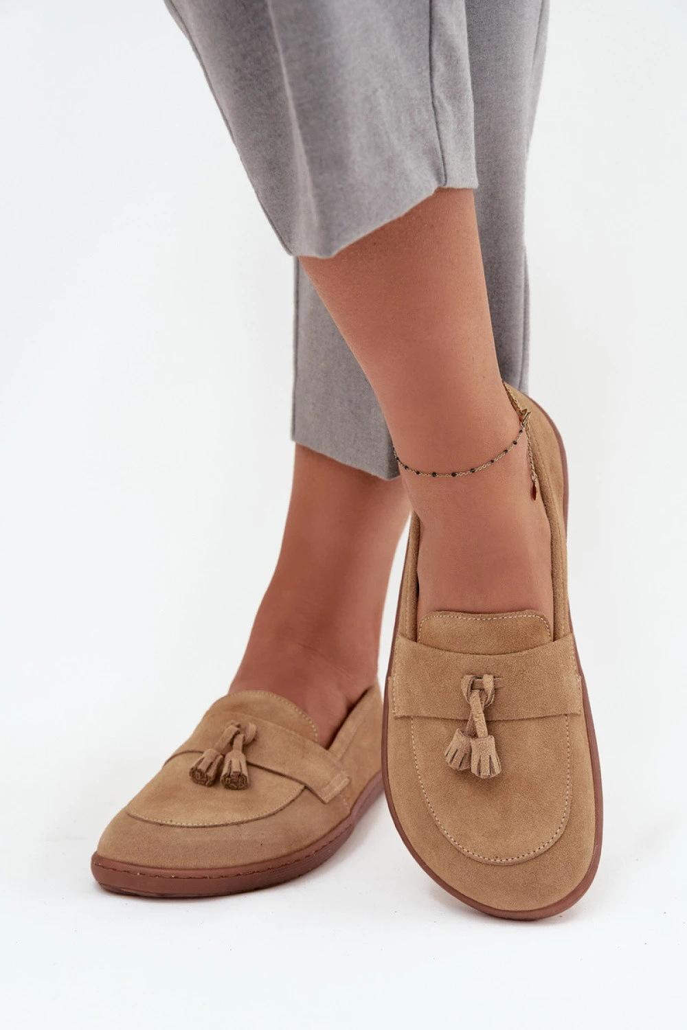 Mokasíny typu barefoot pro ženy jsou nabídkou pro ty, kteří ocení přirozený komfort a volnost pohybu. Vyrobené z měkkého, přírodního semiše se perfektně přizpůsobí tvaru nohy, poskytují příjemný pocit lehkosti a pohodlí během nošení. Na přední části nártu zdobí pásek s dvěma řetízky, které dodávají celku decentní kouzlo a stylový charakter. Jsou to ideální boty na každý den, které se hodí jak do volných, každodenních stylizací, tak do elegantnějších outfitů.