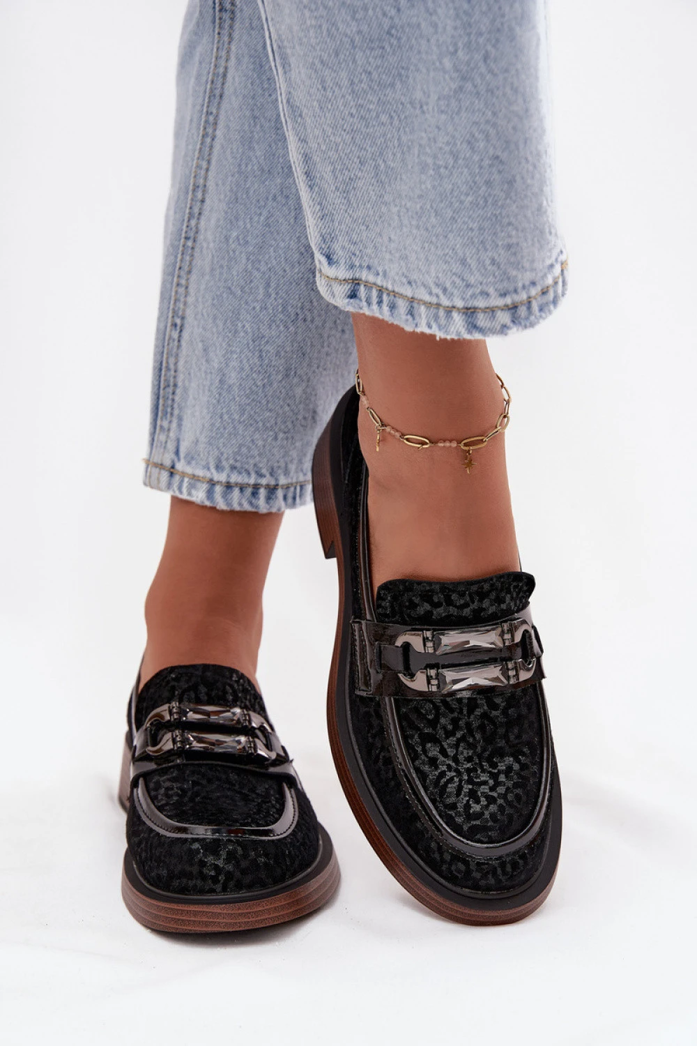 Elegantní dámské mokasíny vyrobené z přírodního semiše. Měkká kůže zaručuje pohodlí při nošení a pečlivé provedení zdůrazňuje jejich nadčasový charakter. Umístěné na stabilním podpatku ve tvaru kostky, poskytují pohodlí po celý den a jemně zdůrazňují postavu. Zaoblené špičky. Umístěný přední ozdobný detail s krystalky dodává originalitu. Tento model se skvěle hodí jak do každodenních stylizací, tak i na speciální příležitosti, jako stylový doplněk ženského šatníku.