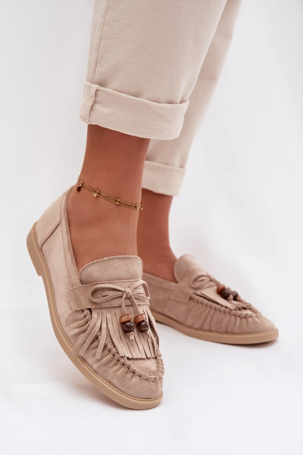 Dámské mokasíny z ekologického semiše jsou stylovým návrhem na každý den. Přední část boty zdobí dekorativní řasy a šněrování ve formě mašle s korálky, které dodávají celku jemný ženský charakter. Měkký materiál zajišťuje pohodlí při nošení a klasický střih zase znamená, že mokasíny skvěle doplní jak casualové, tak elegantnější styly.