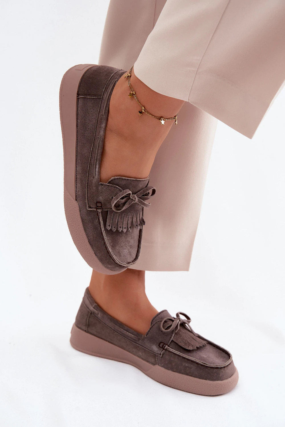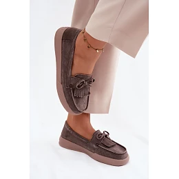 Mokasíny pro ženy z přírodního semiše na platformě jsou stylovým a pohodlným návrhem na každý den. Platforma jemně zvedá postavu a poskytuje pohodlí při chůzi. Přední část boty zdobí efektní šněrování ve formě mašle a dekorativní řasy, které dávají celku originální, ale zároveň ženský charakter. Měkká kožená stélka zvyšuje pohodlí nošení, což z mokasínů činí skvělou volbu i na celý den. Jedná se o ideální volbu pro každodenní styling, jak pro džíny, tak i pro elegantnější outfity.
