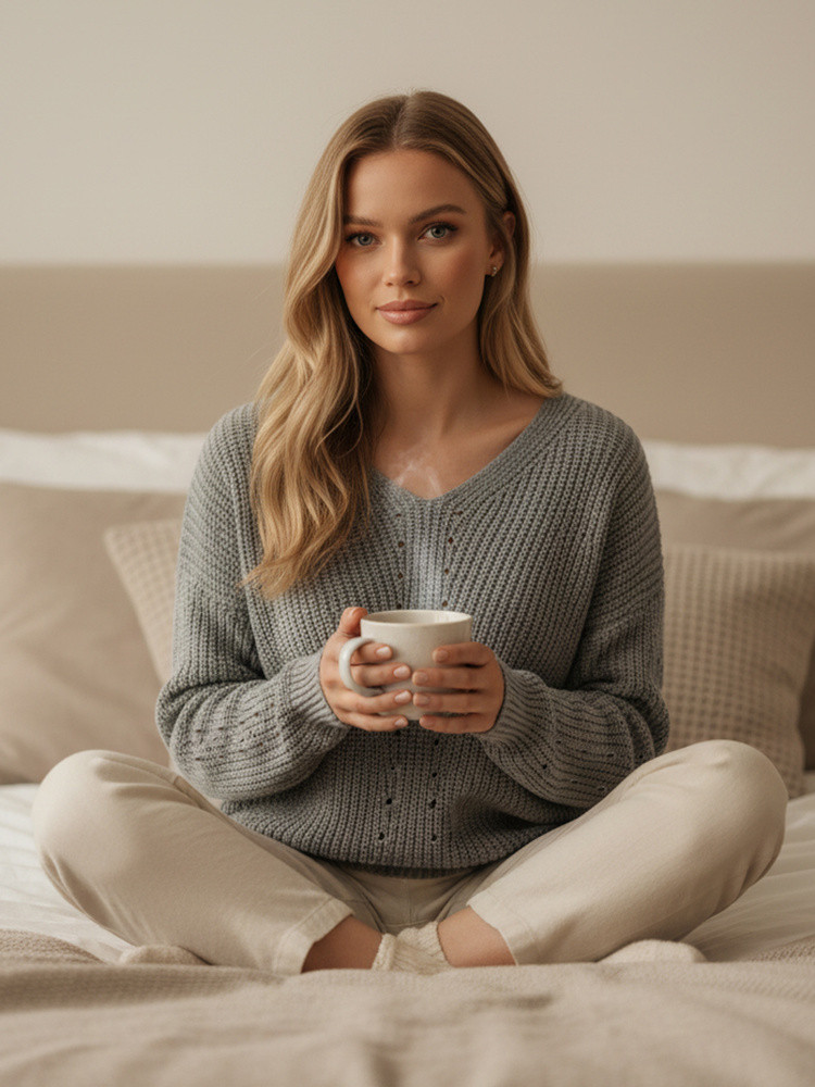 Stylový svetr rovného střihu, který kombinuje klasiku s pohodlím. Měkká tkanina a jemný vzor zaručují pohodlí, zatímco výstřih do V dodává elegantní nádech. Skvěle se hodí k různým ležérním i formálnějším outfitům.