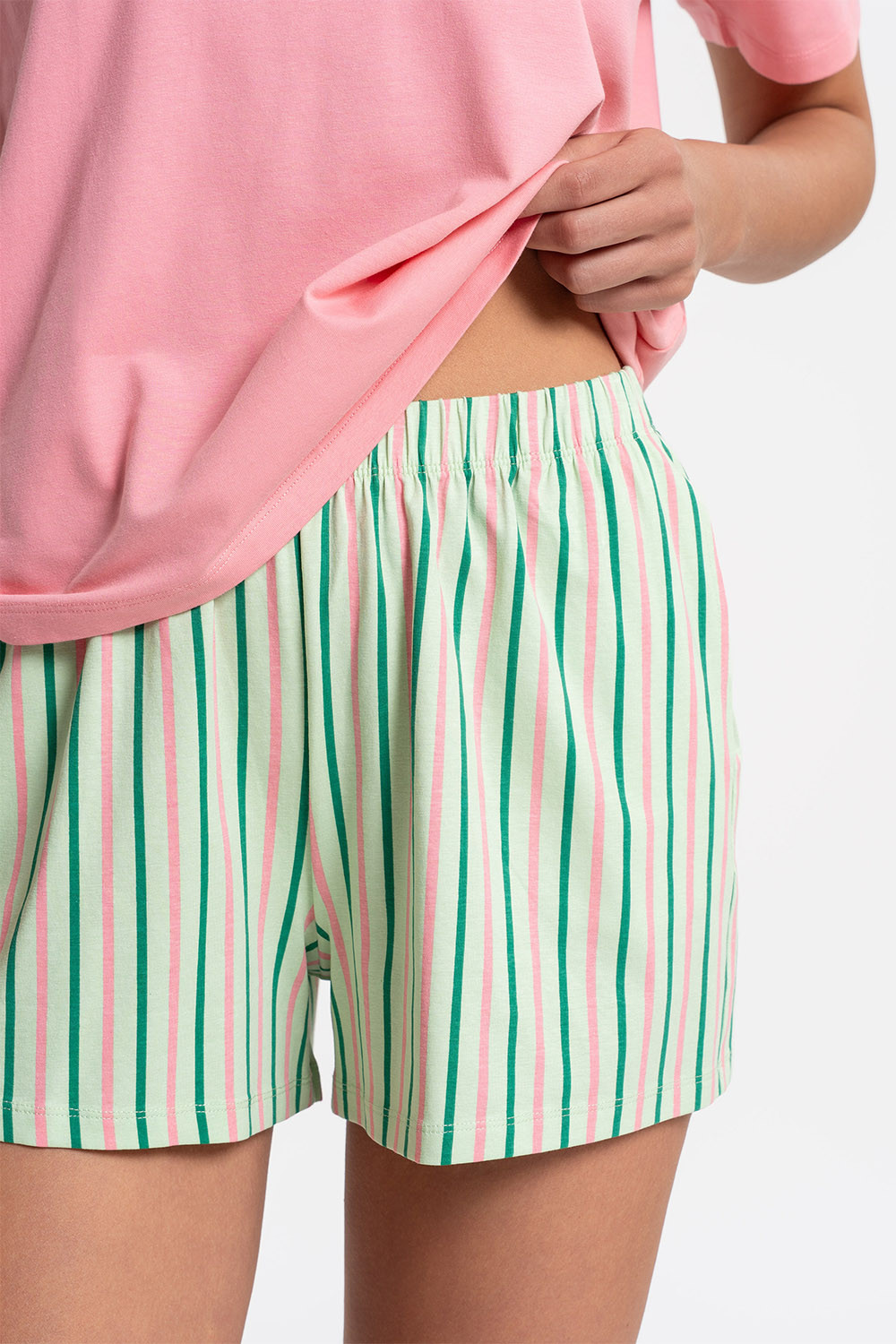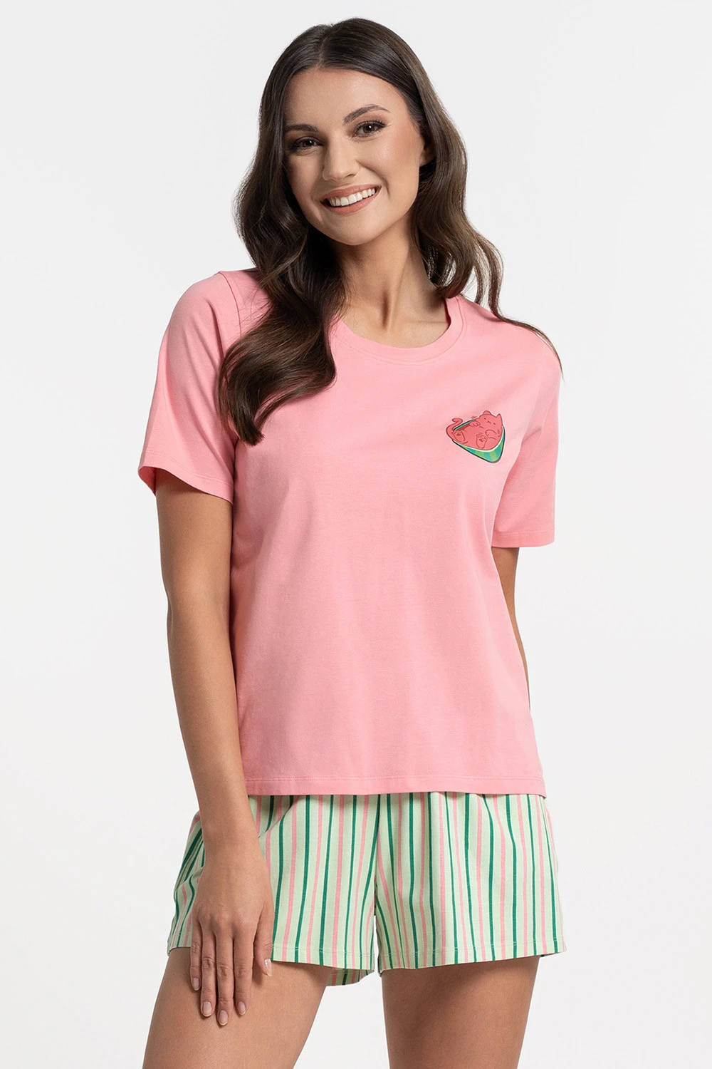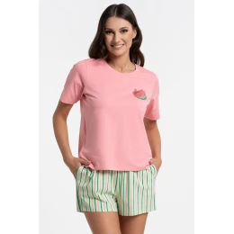Dámské dvoudílné pyžamo Moraj PDD3200-019 z měkkého, prodyšného bavlněného úpletu s přídavkem elastanu. Tričko s krátkým rukávem a kulatým výstřihem zajišťuje volnost pohybu. Krátké šortky jsou vybaveny praktickými kapsami, což zvyšuje komfort každodenního nošení. Jednoduchý, univerzální střih se osvědčí během teplejších nocí a při domácím odpočinku. Složení: 95 % bavlna, 5 % elastan.
