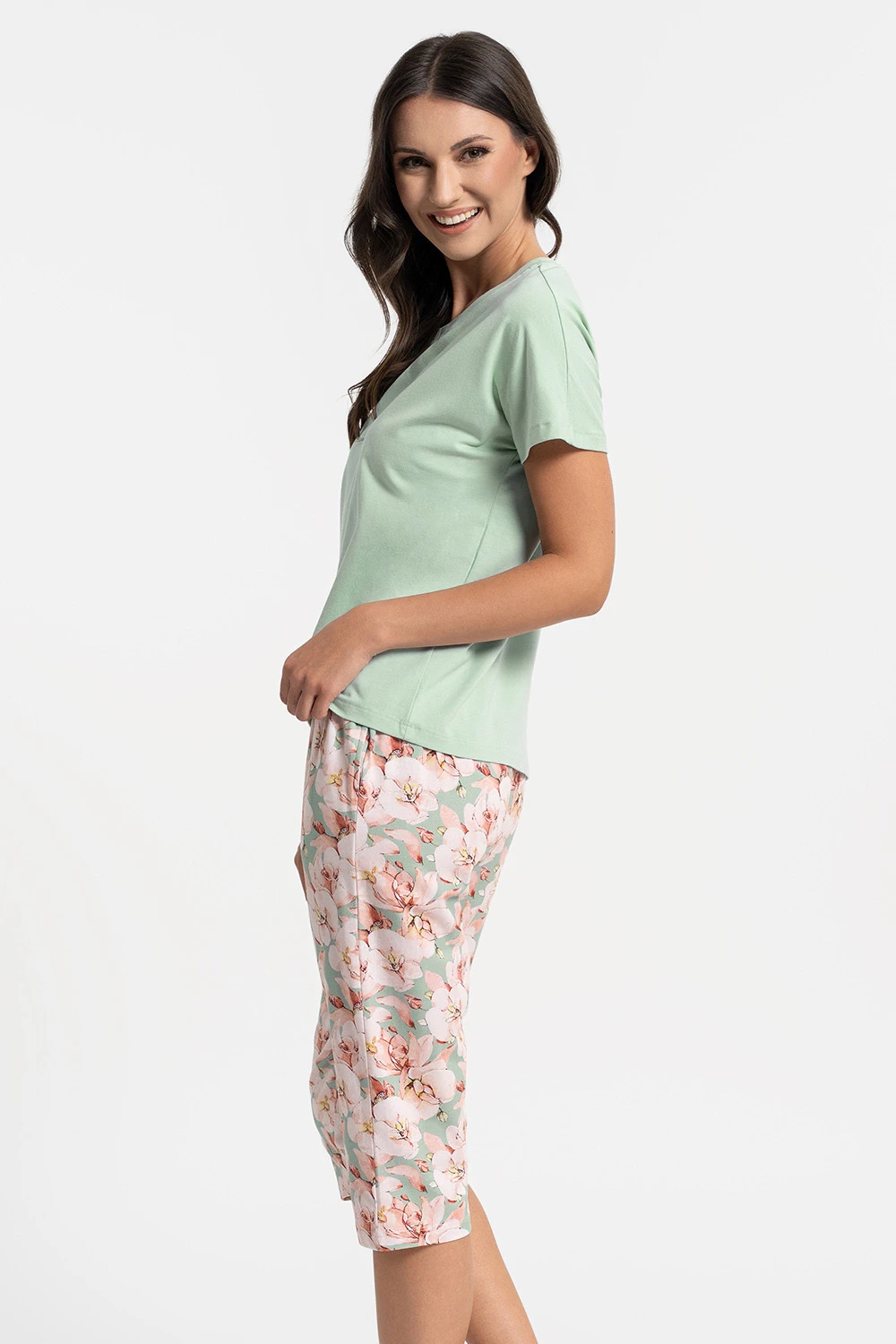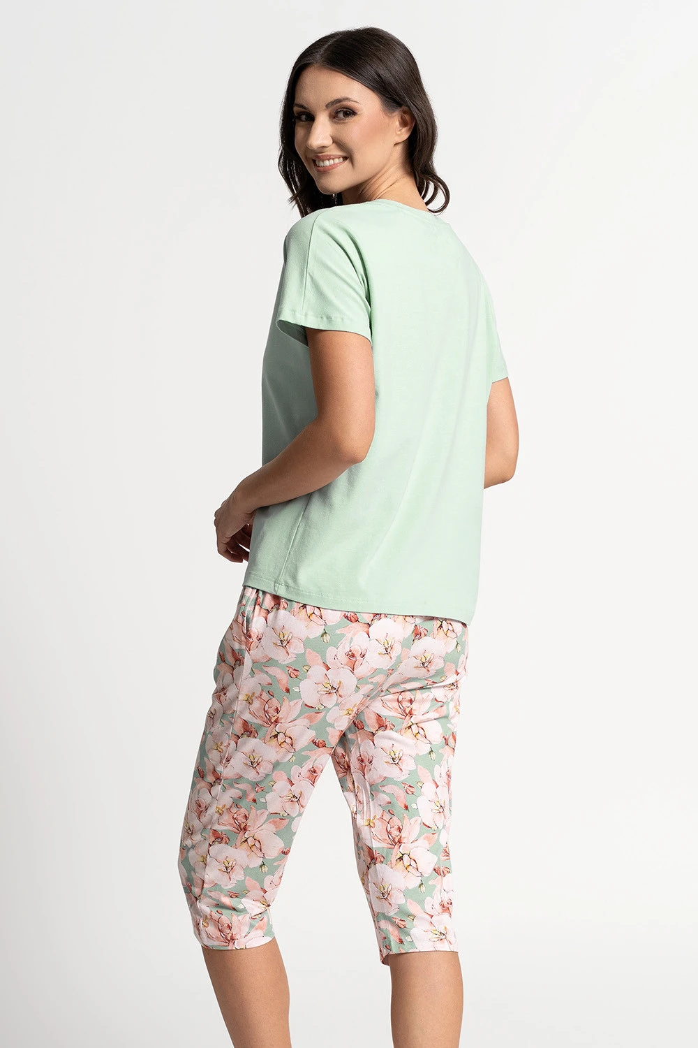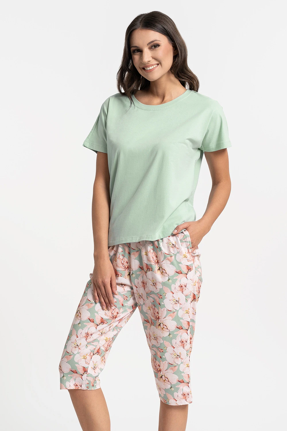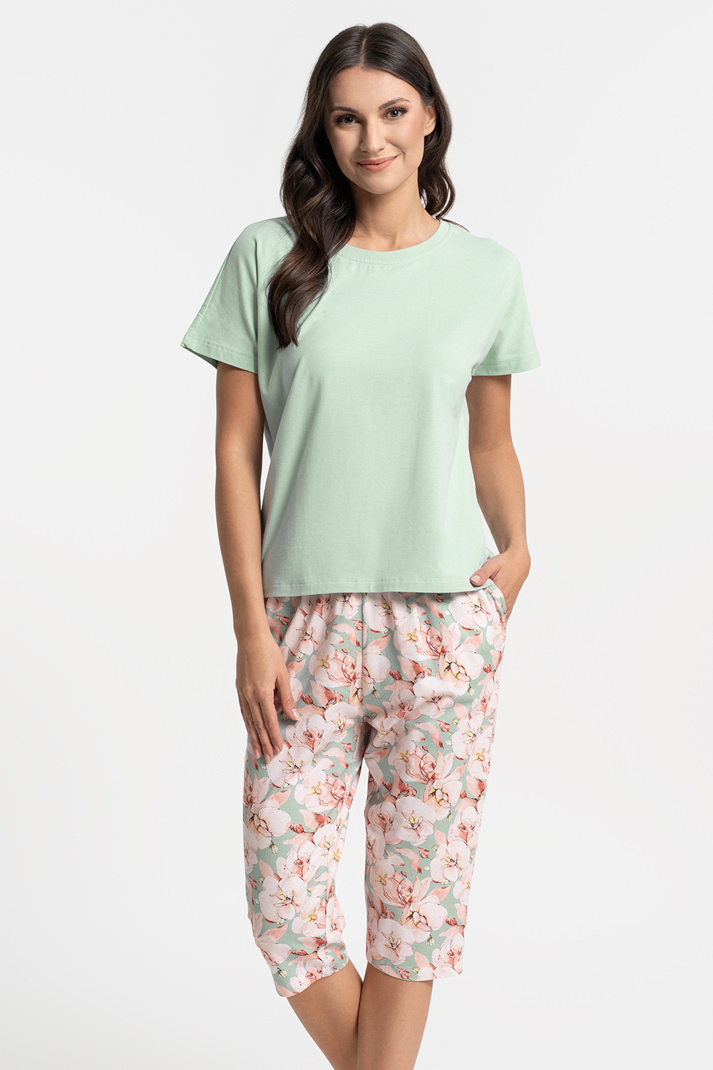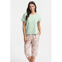 Dámské pyžamo Moraj je dvoudílná souprava: tričko s krátkým rukávem a kalhoty 3/4. Elastický pas a boční kapsy zvyšují pohodlí a funkčnost. Tlumený horní díl dobře ladí se vzorovaným spodním dílem a vytváří tak každodenní praktickou soupravu. Bavlněný úplet s elastanem je měkký a příjemný na dotek. Složení: 95 % bavlna, 5 % elastan.