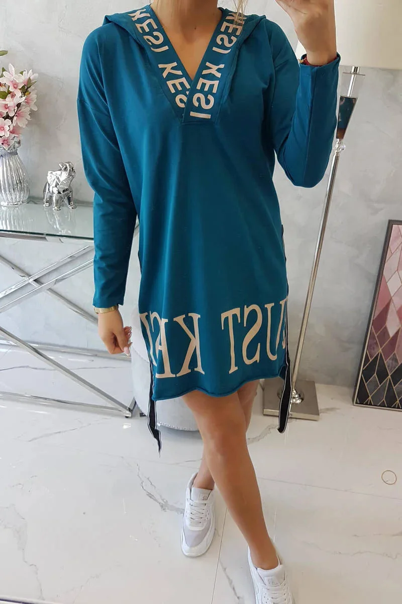 Představujeme vám pohodlné šaty. Šaty s kapucí a potiskem. Potisk na přední straně a na kapuci, šaty mají delší zadní díl. Ozdobné pásky na bocích. Šaty jsou vyrobeny z vysoce kvalitního materiálu. Velikost je univerzální a vyhovuje dámám, které nosí velikost S, M nebo L.