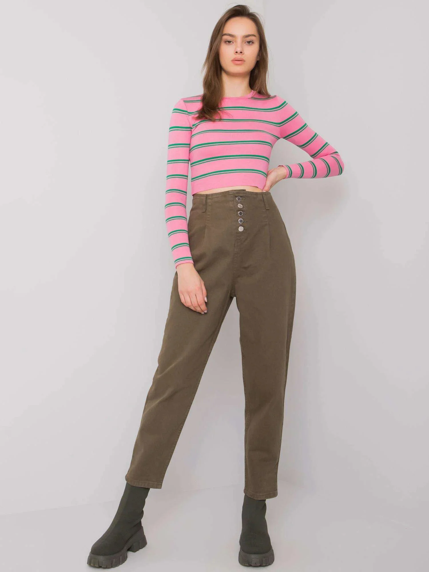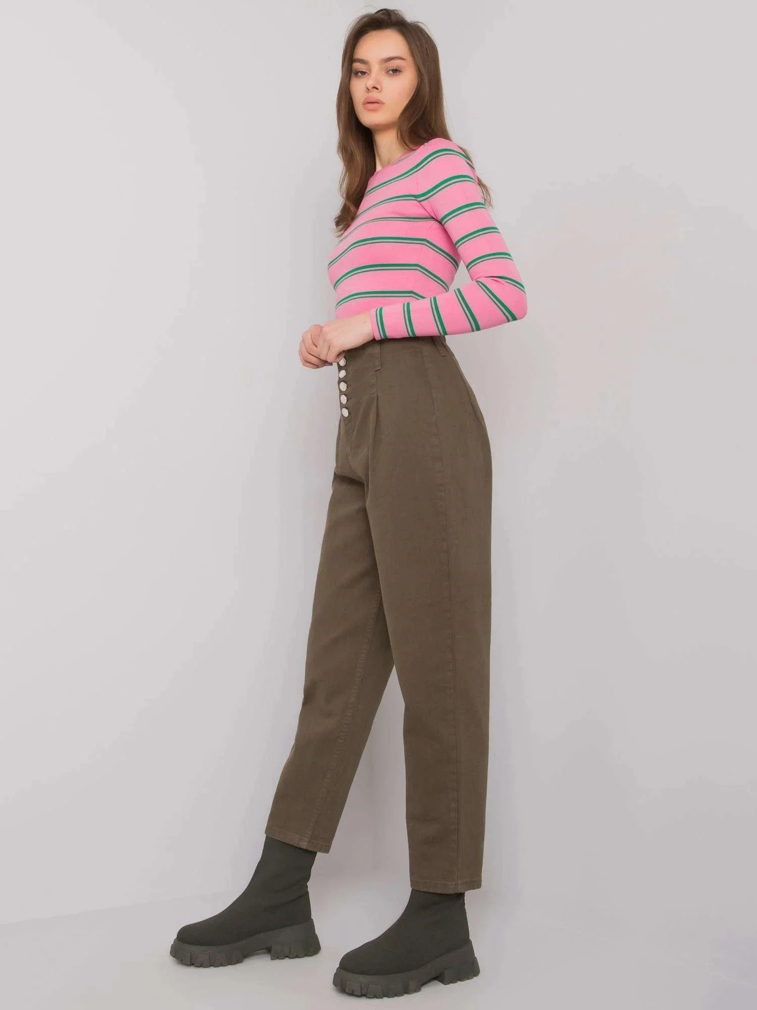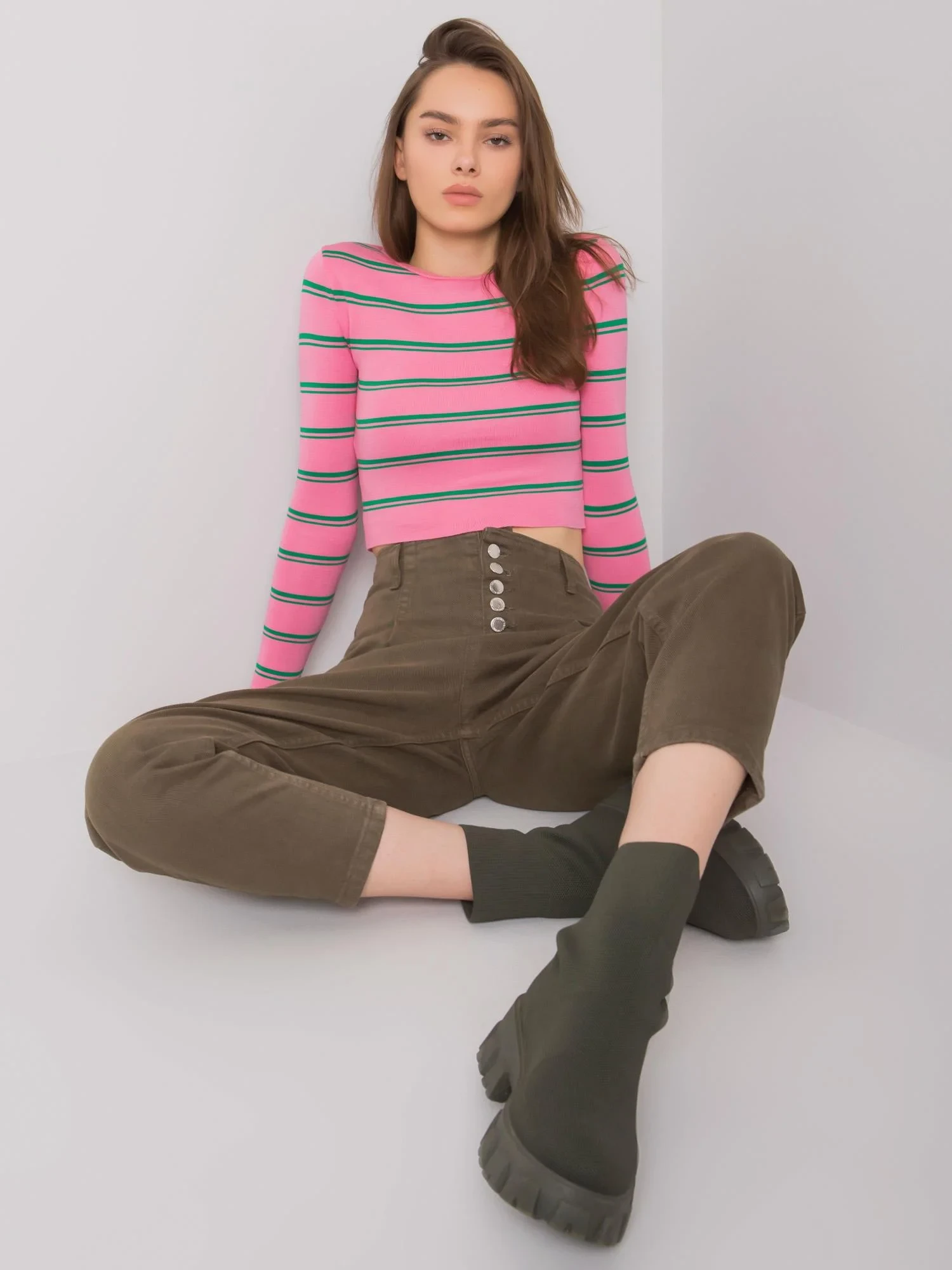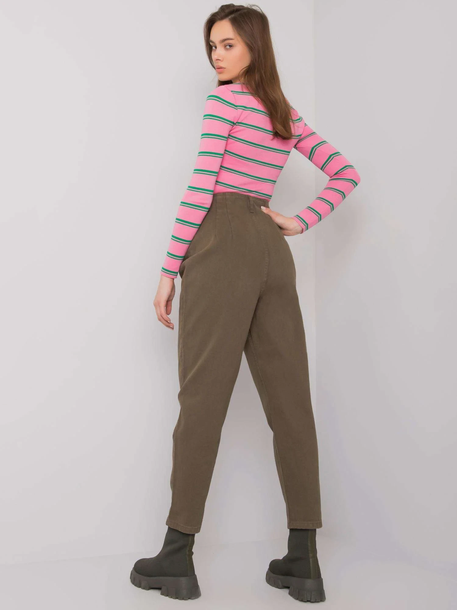 Modelka má na sobě velikost 27. Rozměry modelky: výška 176 cm, poprsí 85 cm, pas 61 cm, boky 91 cm.