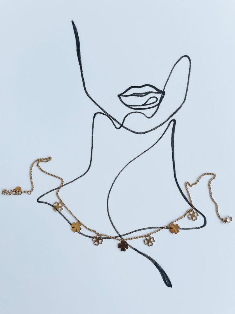 Mimořádně jemný návrh ve zlaté barvě zpestřený ozdobnými přívěsky imitujícími čtyřlístky. Má zapínání s nastavitelnou délkou. Skvěle se hodí ke každé stylizaci. Bude se hodit i jako dárek.