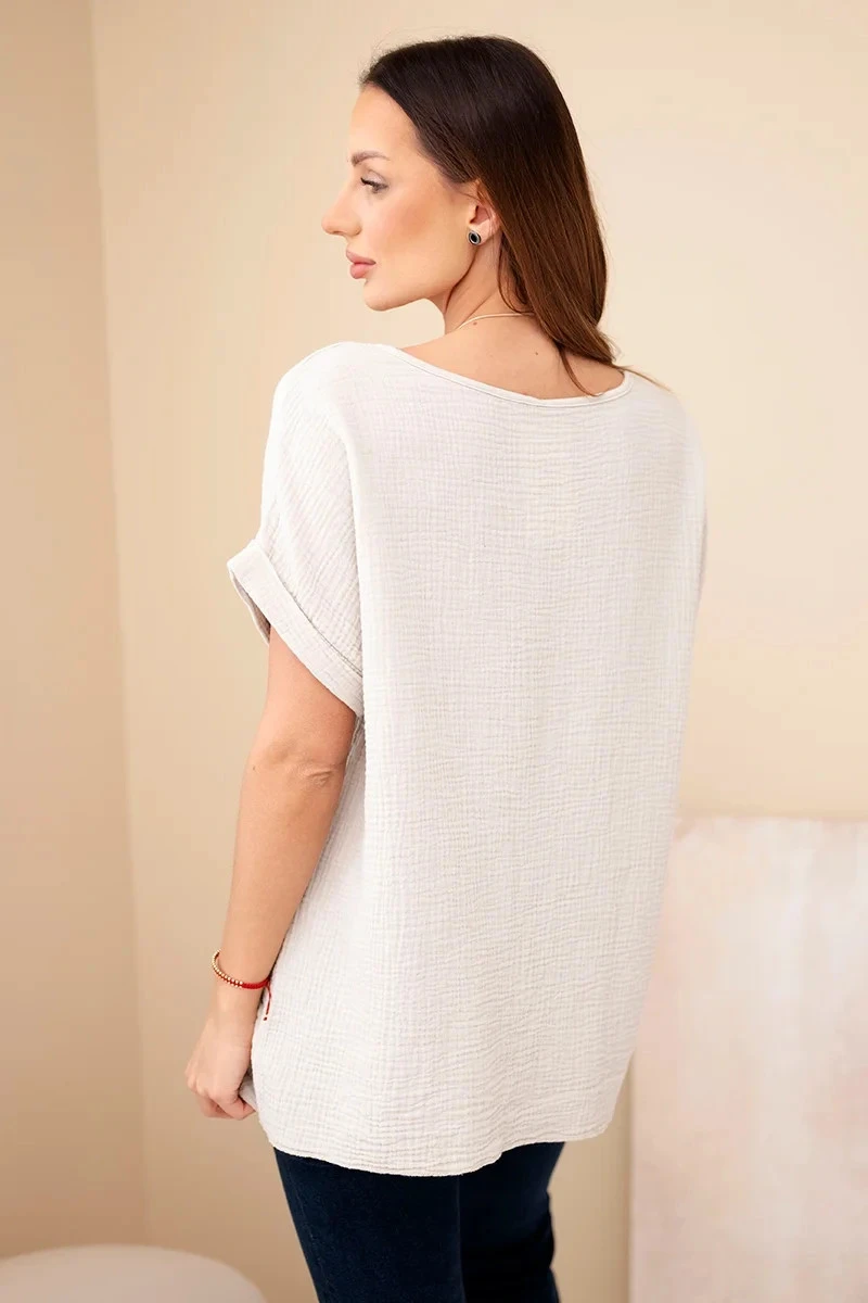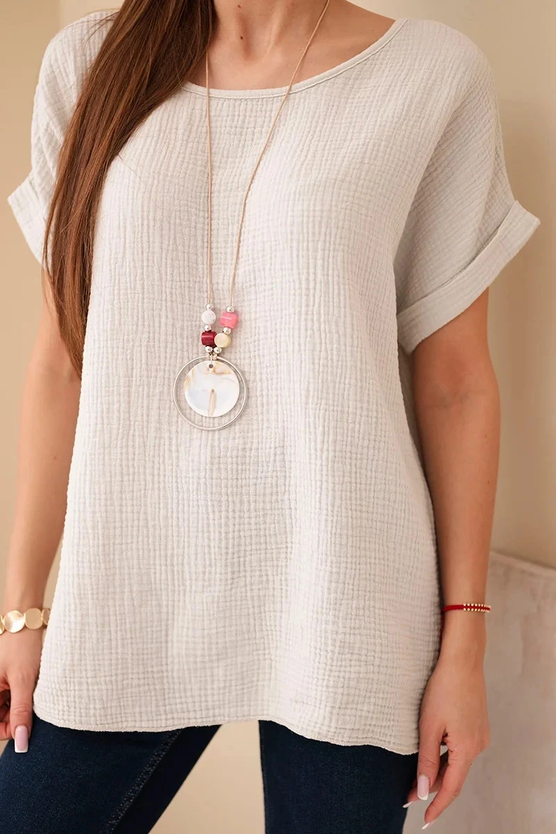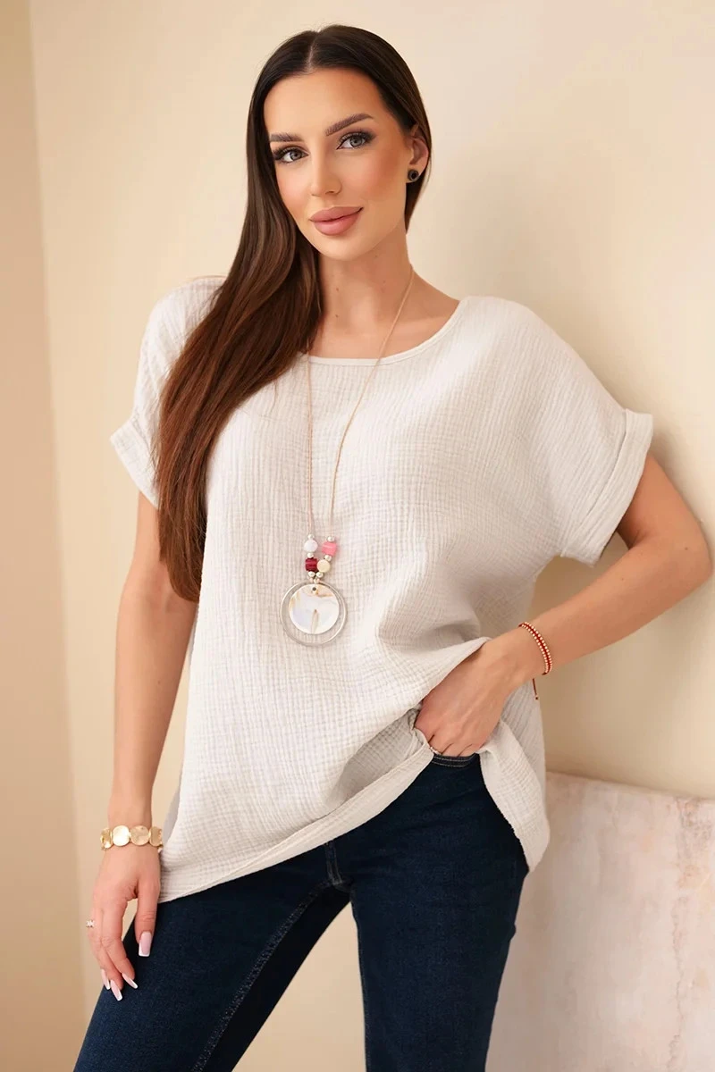 Mušelínová halenka s náhrdelníkem je ideální volbou pro ženy, které ocení jemný styl a výjimečné pohodlí při nošení. Vyrobena z lehkého, prodyšného mušelínu, poskytuje jemnost a volnost pohybu po celý den. Její volný, elegantní střih zajišťuje dokonalé přizpůsobení postavě a podtrhuje její přirozenou krásu. Halenku doplňuje ozdobný náhrdelník, který jí dodává charakter a eliminuje potřebu dalších doplňků. Tento model se skvěle hodí jak na každodenní nošení, tak i na formálnější příležitosti. Můžete ji kombinovat s džíny, elegantními kalhotami nebo sukní a vytvořit tak perfektní outfit pro každou příležitost. Zvolte mušelínovou halenku s náhrdelníkem a užívejte si nadčasovou eleganci v lehkém, ženském provedení. Velikost je univerzální a vhodná pro ženy nosící velikosti S, M nebo L.