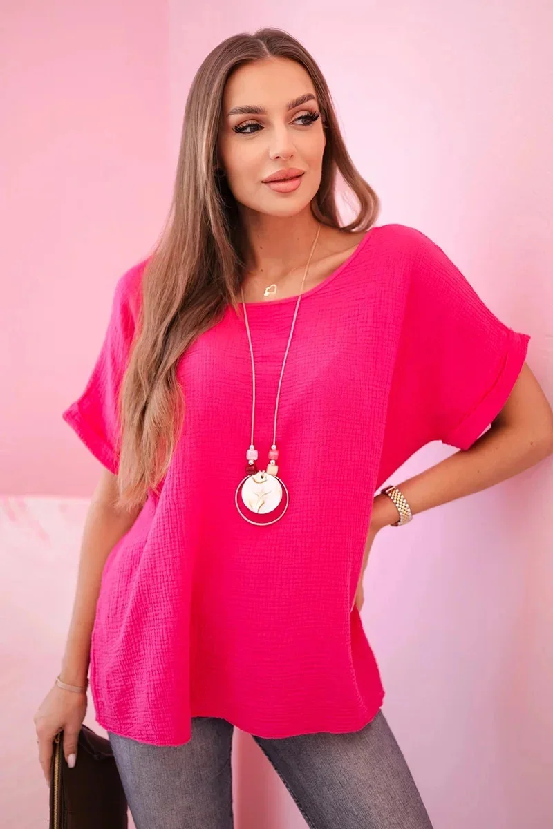 Mušelínová halenka s náhrdelníkem je ideální volbou pro ženy, které ocení jemný styl a výjimečné pohodlí při nošení. Vyrobena z lehkého, prodyšného mušelínu, poskytuje jemnost a volnost pohybu po celý den. Její volný, elegantní střih zajišťuje dokonalé přizpůsobení postavě a podtrhuje její přirozenou krásu. Halenku doplňuje ozdobný náhrdelník, který jí dodává charakter a eliminuje potřebu dalších doplňků. Tento model se skvěle hodí jak na každodenní nošení, tak i na formálnější příležitosti. Můžete ji kombinovat s džíny, elegantními kalhotami nebo sukní a vytvořit tak perfektní outfit pro každou příležitost. Zvolte mušelínovou halenku s náhrdelníkem a užívejte si nadčasovou eleganci v lehkém, ženském provedení. Velikost je univerzální a vhodná pro ženy nosící velikosti S, M nebo L.