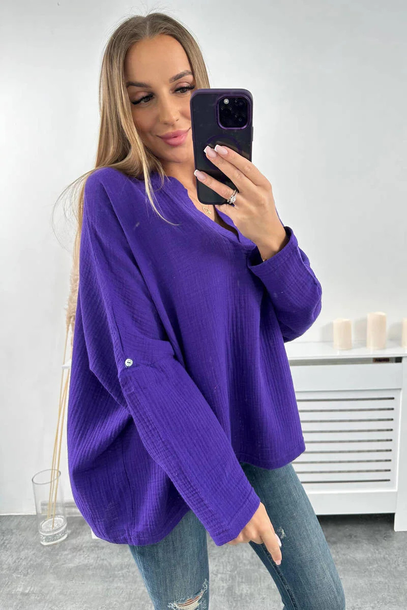 Mušelínová halenka s ohrnutými rukávy tmavě fialová