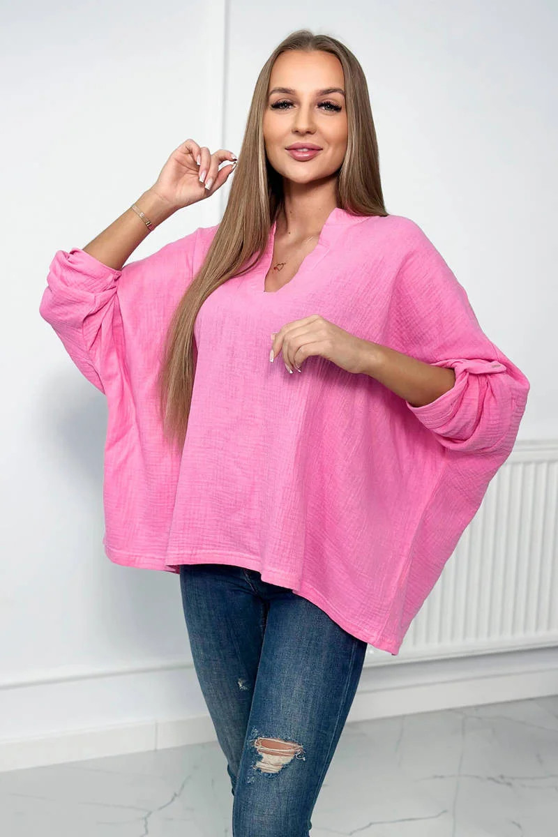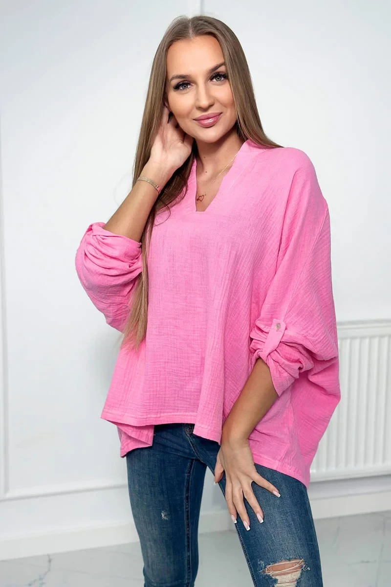 Mušelínová halenka s ohrnutými rukávy tmavě růžová