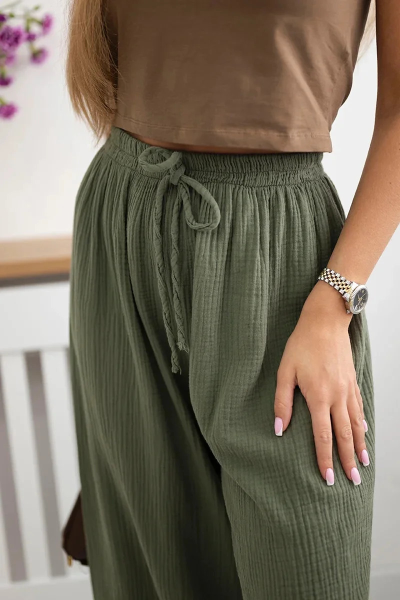 Objevte jedinečné kalhoty vyrobené z jemného, prodyšného mušelínu, které poskytují nevídaný komfort nošení i v nejteplejších dnech. Jejich široká nohavice dodává celému outfitu módní, moderní charakter, opticky prodlužuje postavu a přidává lehkost celkovému stylu. Ideální pro každodenní nošení, do práce i na výjimečné příležitosti – tyto kalhoty se skvěle kombinují s různými topy, od minimalistických triček, přes elegantní halenky až po svetry. Vsaďte na klasický, ale zároveň sofistikovaný design, který vám umožní užívat si pohodlí i originální styl. Velikost je univerzální a odpovídá ženám nosícím velikosti S, M nebo L.