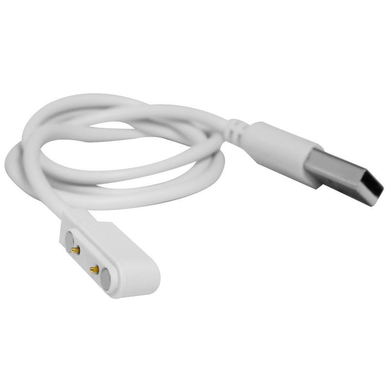 Kabel v bílé barvě, zakončený na jedné straně konektorem USB a na druhé straně kolíky, které jsou přitahovány magnetem.
