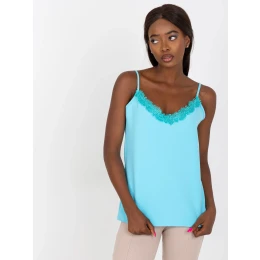 Modrý top bez ramínek s krajkou .