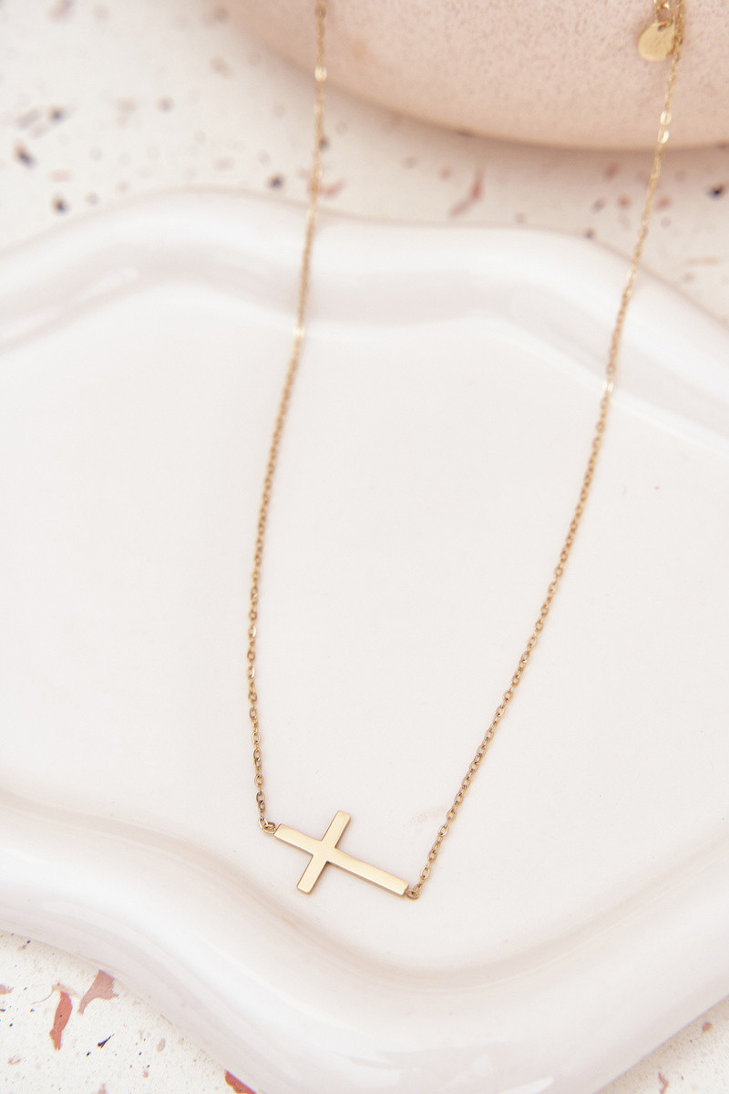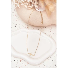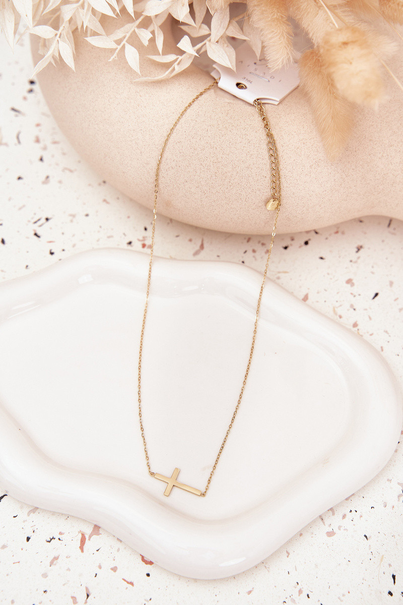 Náhrdelník pro ženy vyrobený ze chirurgické oceli v zlaté barvě. Nastavitelný zapínání umožňuje upravit délku podle výstřihu, zajišťující pohodlí při nošení. Celý doplněk doplňuje přívěsek ve tvaru kříže, který dodává šperku jemný, klasický charakter. Ideální na každý den i pro elegantnější stylizace.