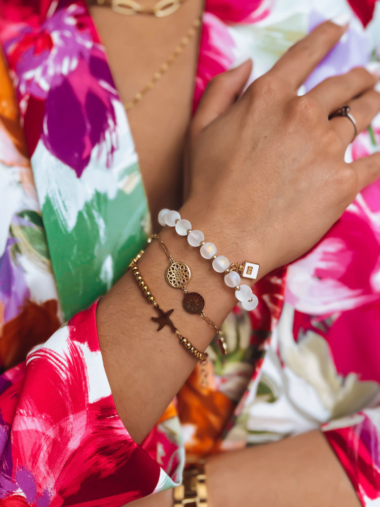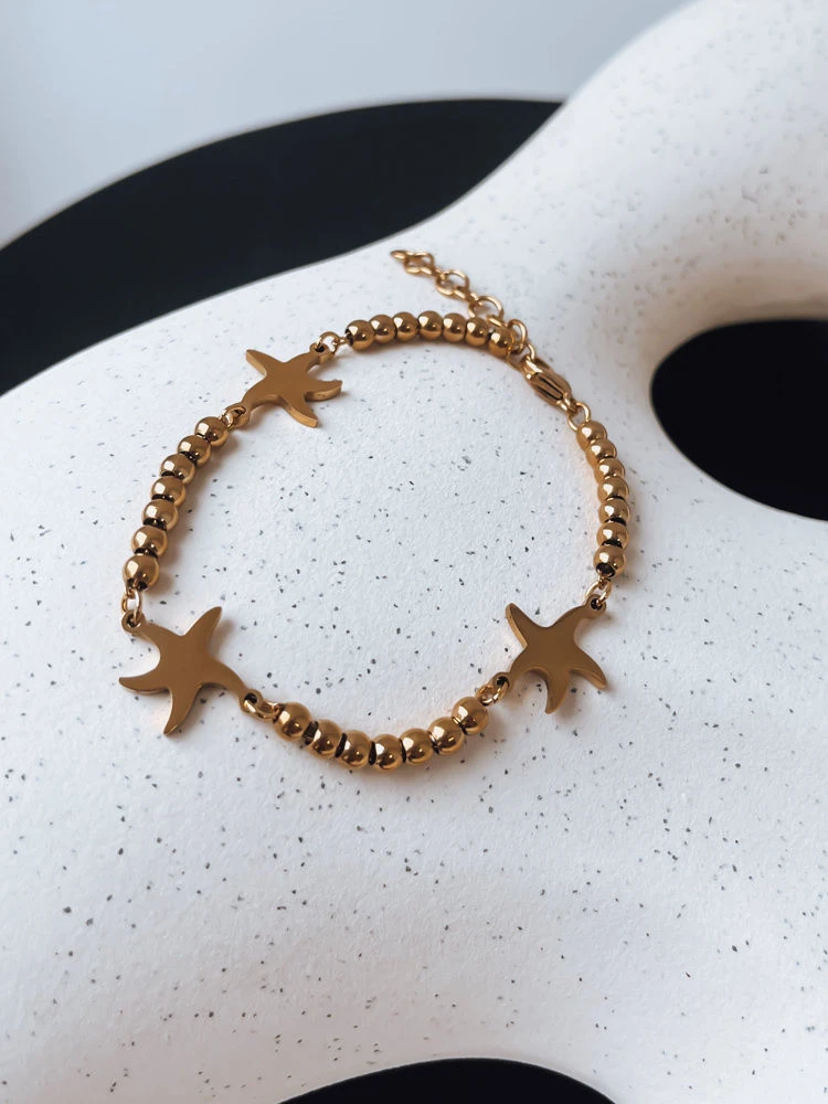 Náramek ETOLIE je poutavý design ve zlaté barvě. Model má zlaté kuličky v kombinaci s mořskými hvězdicemi a bude ideální volbou na léto.