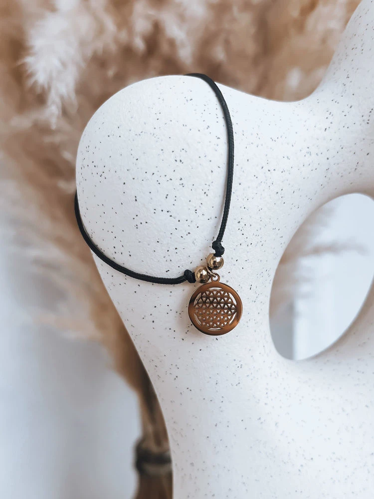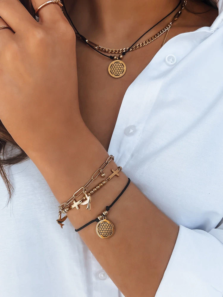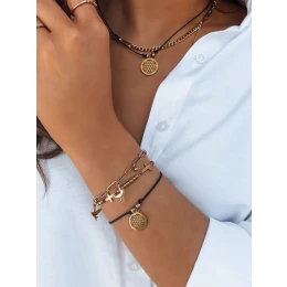 Náramek LANZAROTE je návrh, který bude vypadat skvěle jako doplňkový šperk i samostatně. Na černé šňůrce je umístěn ozdobný přívěsek ve zlaté barvě. Zapínání je nastavitelné.