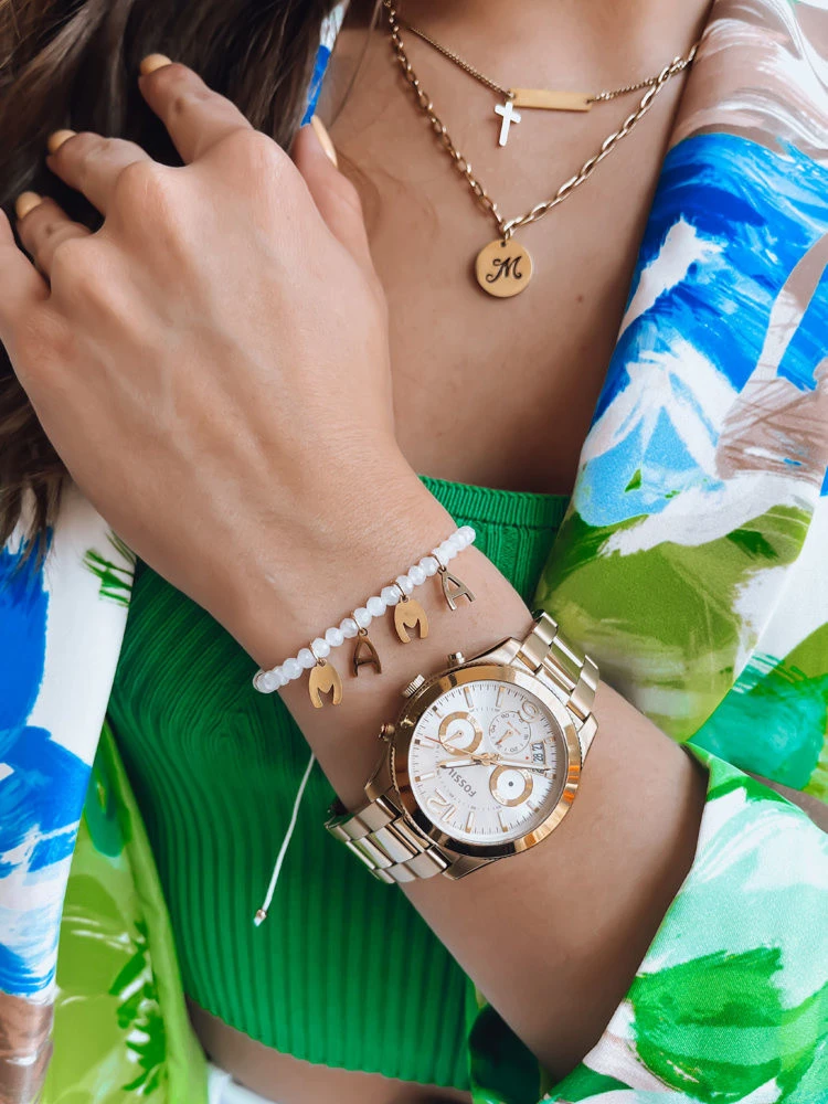 Tento okouzlující korálkový náramek se zavěšenými písmeny je nejen krásným doplňkem vašeho šatníku, ale také jedinečným způsobem, jak vyjádřit lásku k nejdůležitější osobě ve vašem životě - vaší mamince. Náramek je vyroben z jemně leštěných korálků, které na světle září, a vyzařuje eleganci a jemnost. To však není vše - zavěšená písmena, která tvoří slovo "máma", dodávají celému designu osobní a jedinečný nádech.