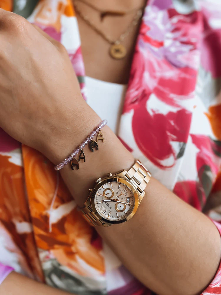 Tento okouzlující korálkový náramek se zavěšenými písmeny je nejen krásným doplňkem vašeho šatníku, ale také jedinečným způsobem, jak vyjádřit lásku k nejdůležitější osobě ve vašem životě - vaší mamince. Náramek je vyroben z jemně leštěných korálků, které na světle září, a vyzařuje eleganci a jemnost. To však není vše - zavěšená písmena, která tvoří slovo "máma", dodávají celému designu osobní a jedinečný nádech.