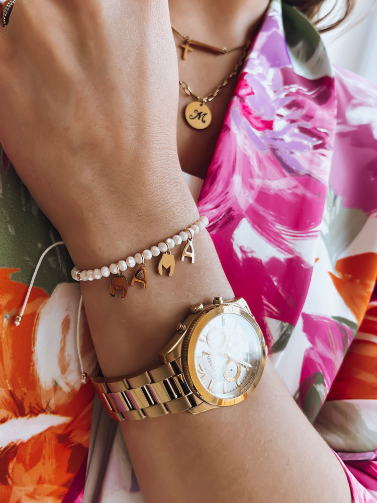 Tento okouzlující korálkový náramek se zavěšenými písmeny je nejen krásným doplňkem vašeho šatníku, ale také jedinečným způsobem, jak vyjádřit lásku k nejdůležitější osobě ve vašem životě - vaší mamince. Náramek je vyroben z jemně leštěných korálků, které na světle září, a vyzařuje eleganci a jemnost. To však není vše - zavěšená písmena, která tvoří slovo "máma", dodávají celému designu osobní a jedinečný nádech.