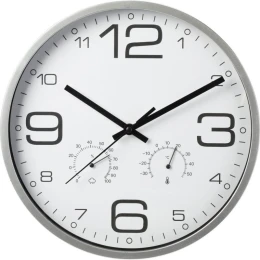 NÁSTĚNNÉ HODINY 30CM S TERMOMETREM STŘÍBRNÉ jsou moderní hodiny s přehledným zobrazením času, teploty a úrovně vlhkosti. Mají jednoduchý, minimalistický design a jsou ideální do kanceláří, moderních interiérů i na pracoviště.