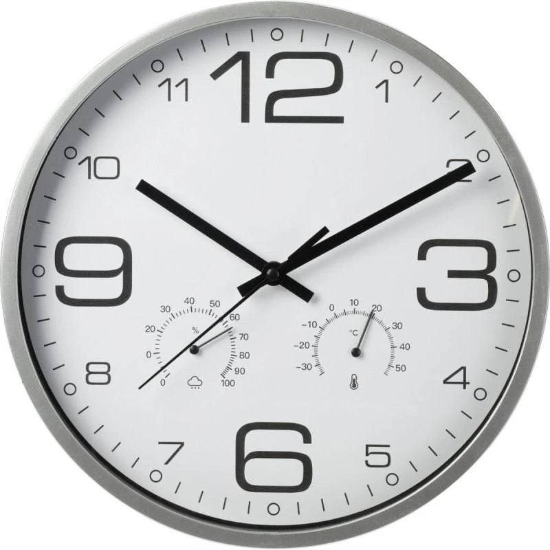 NÁSTĚNNÉ HODINY 30CM S TERMOMETREM BÍLÉ jsou moderní hodiny s přehledným zobrazením času, teploty a úrovně vlhkosti. Mají jednoduchý, minimalistický design a jsou ideální do kanceláří, moderních interiérů i na pracoviště.