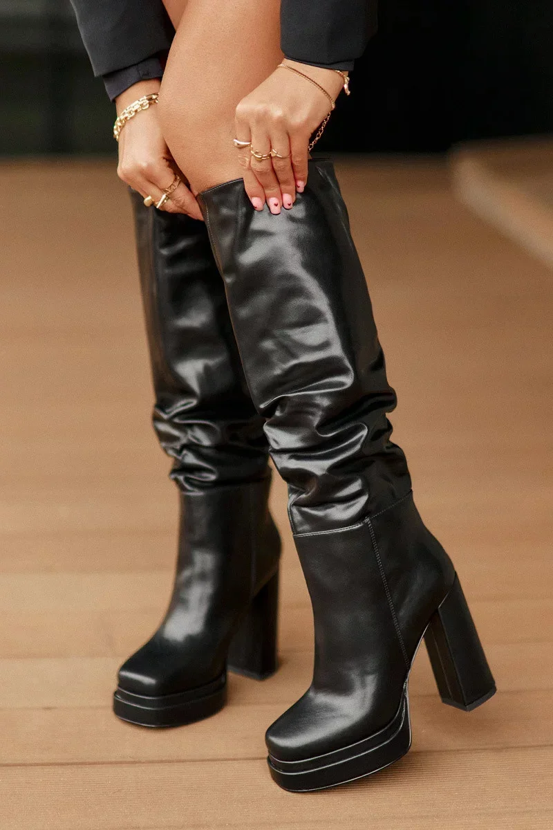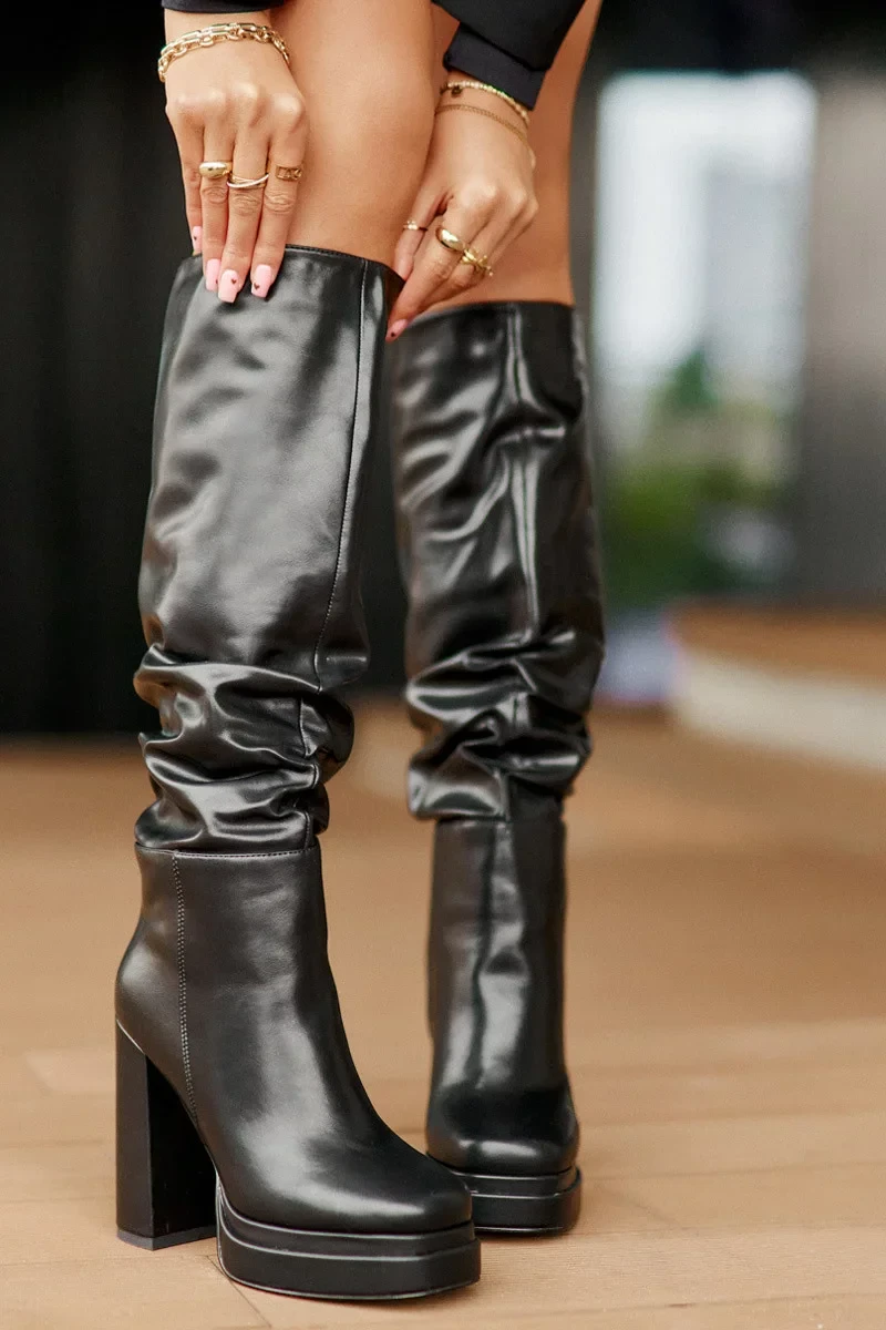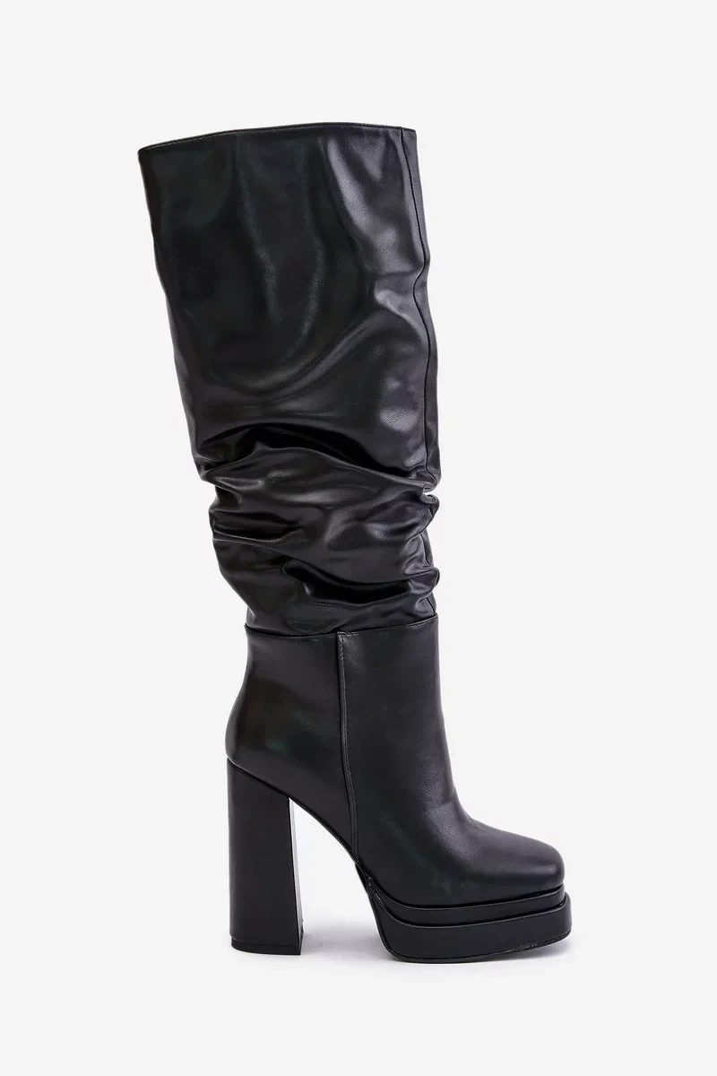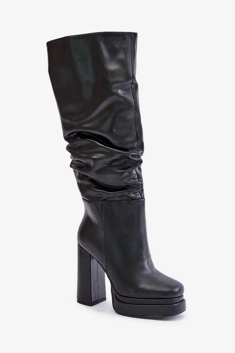 Nazouvací kozačky na podpatku a platformě s řasením zateplené černé Beridra