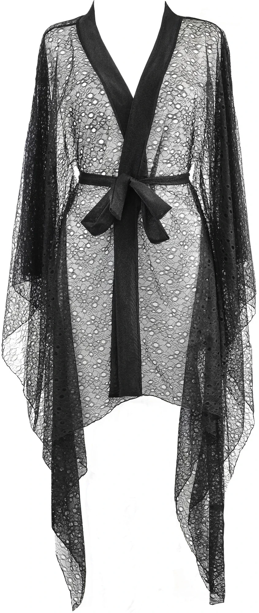 Jemný průhledný vzor bohatě zdobené černé krajky obepíná tělo a naše nové pareo neuvěřitelně podněcuje představivost. Negližé má tylový a třpytivý pásek, kterým lze upravit lem podle potřeby. Zahalte se do smyslnosti AXAMI.