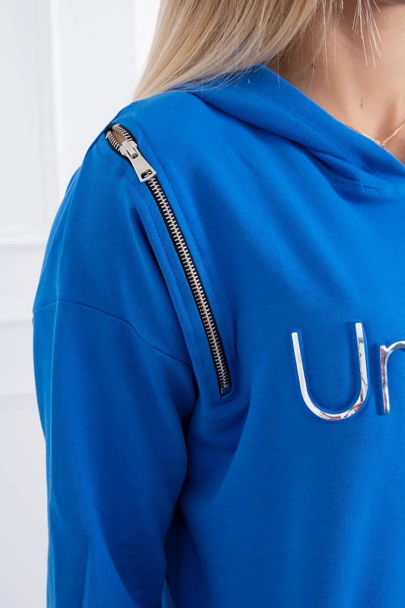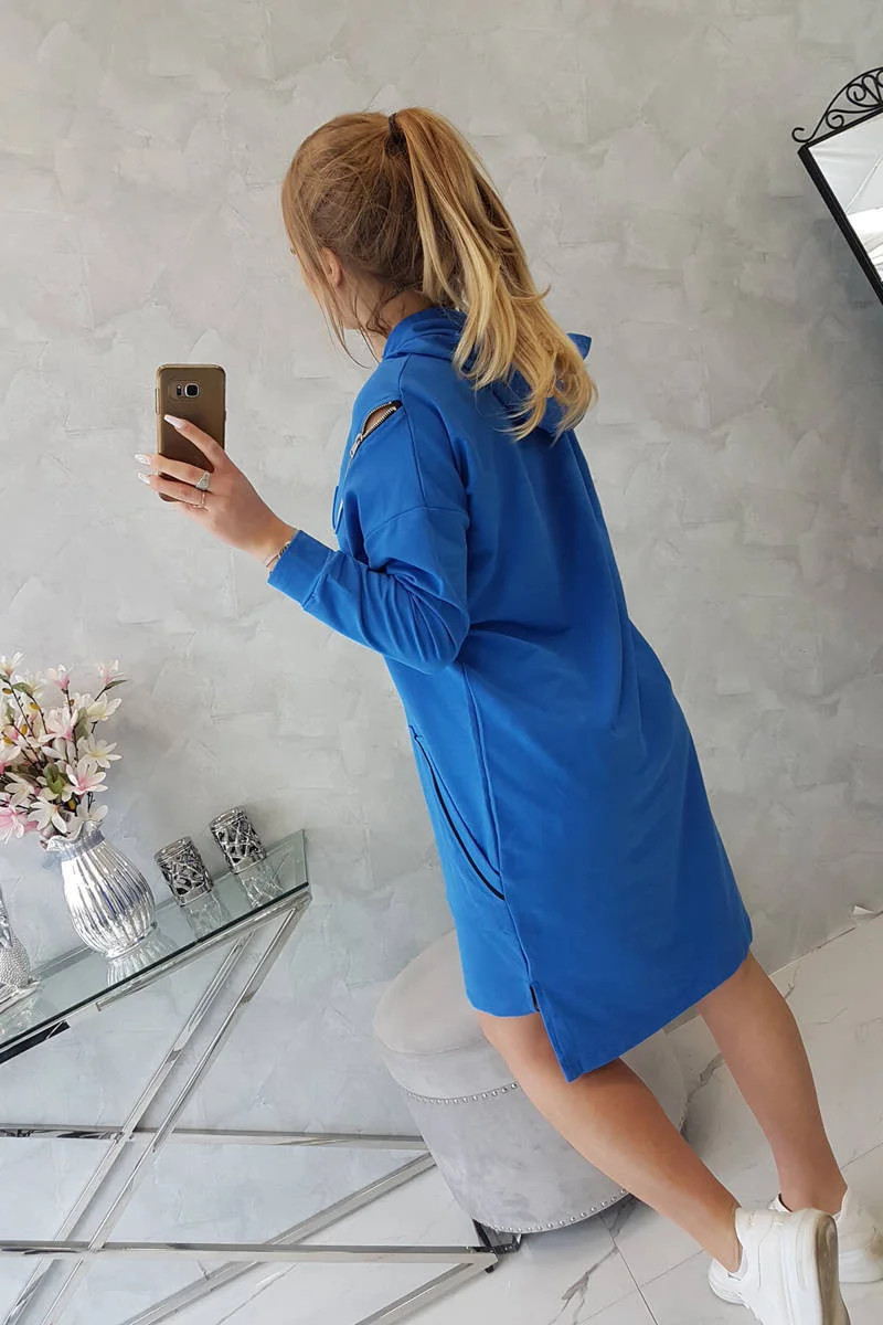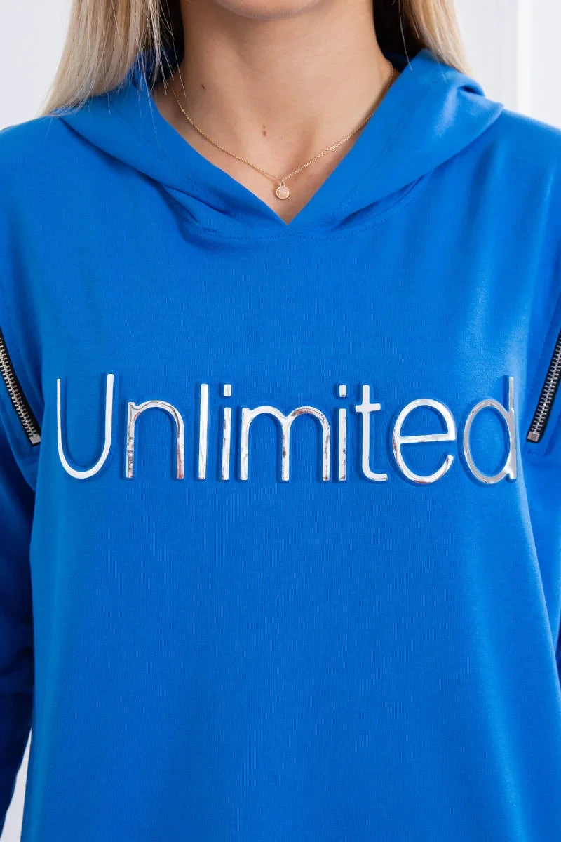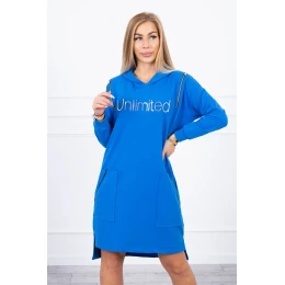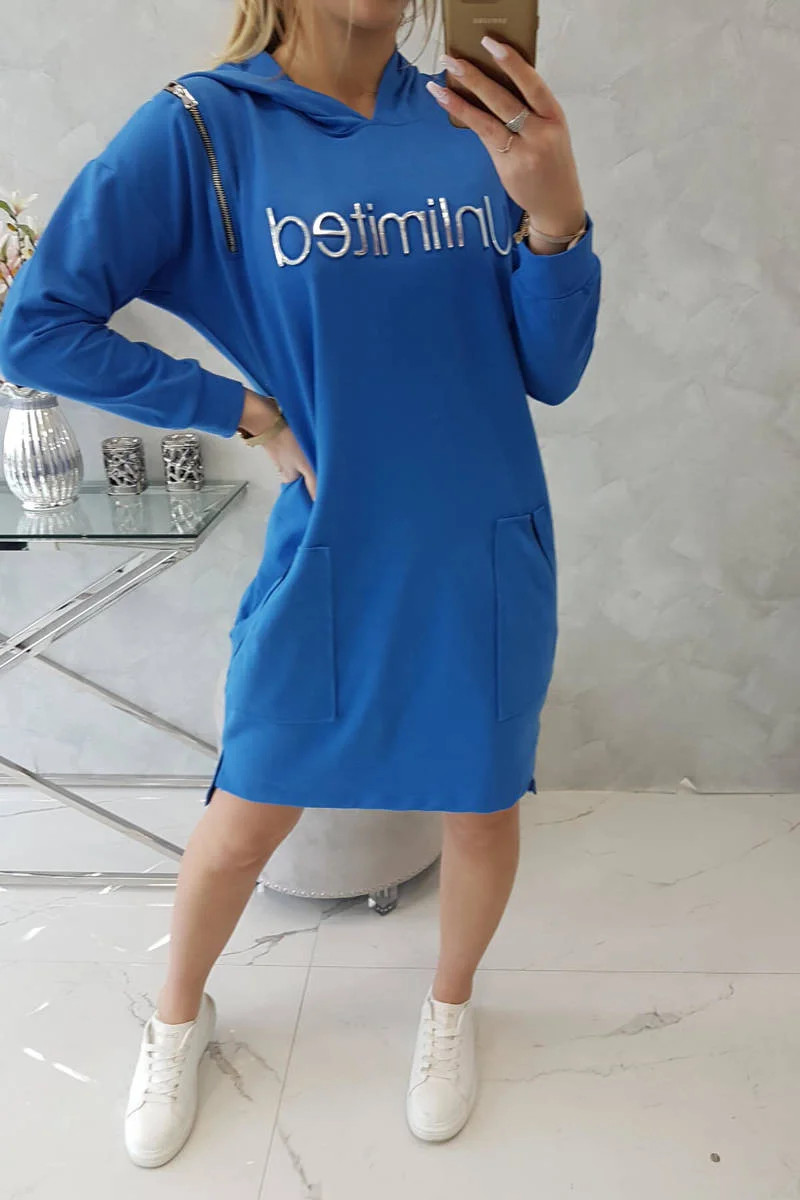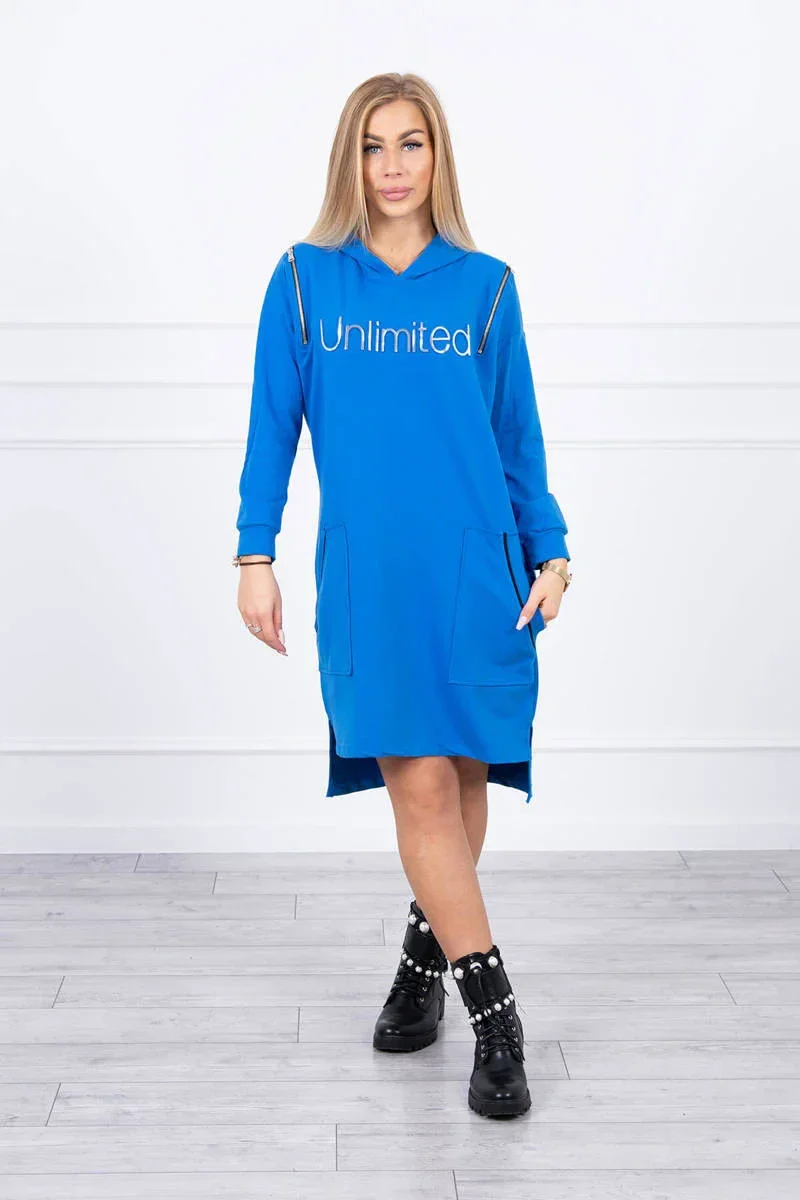 Představujeme vám módní šaty. Na šatech je nápis unlimited. Vrchní část šatů má svislé zipy. Šaty s delšími zády a kapucí. Šaty s kapsami s nášivkami. Ideální každodenní poloha. Šaty jsou vyrobeny z vysoce kvalitního materiálu. Velikost je univerzální a vyhovuje dámám, které nosí velikost S, M nebo L.