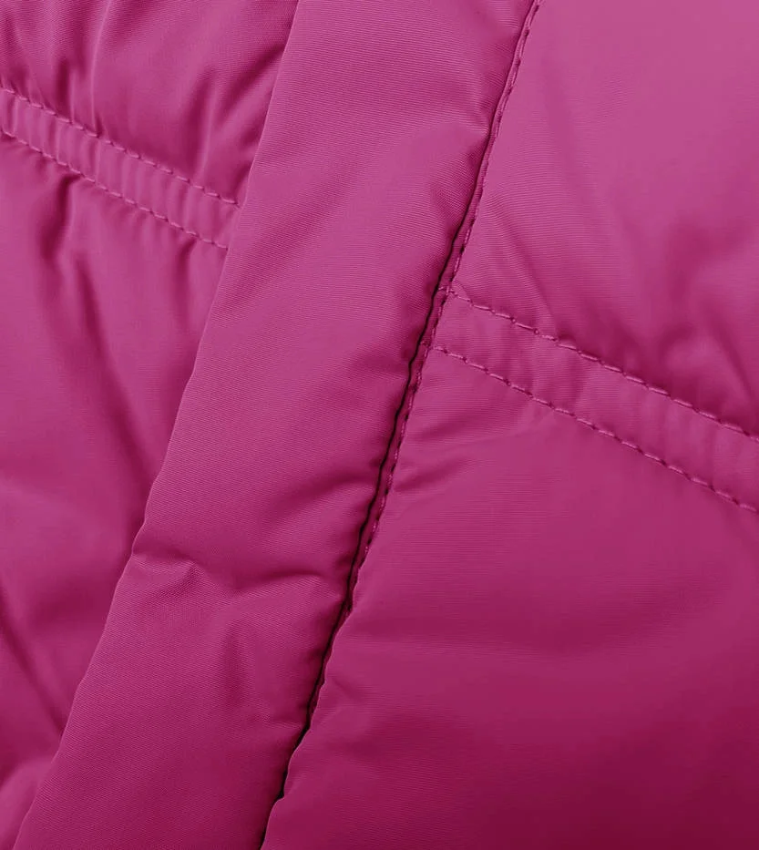 Bunda má volný střih, je zateplená syntetickou péřovou výplní, má dvě kapsy se zapínáním na patentky a zapíná se zipem. Model má stojáček a kapuci, kterou není možné odepnout. Na koncích rukávů jsou skryté stahovací lemy. Bunda má délku k bokům.